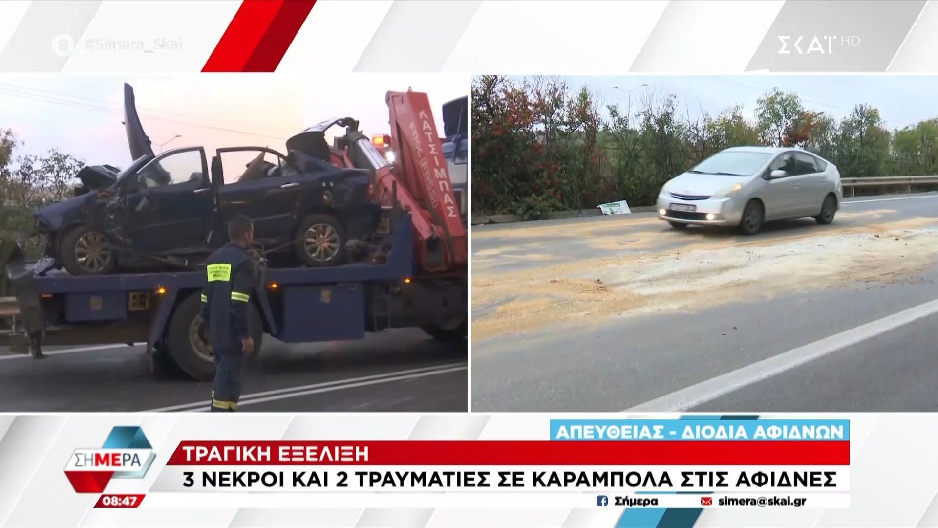 Σοβαρό τροχαίο δυστύχημα σημειώθηκε το πρωί της Παρασκευής στον παράδρομο της Αθηνών – Λαμίας, κοντά στα διόδια Αφιδνών. Τρία ΙΧ οχήματα συγκρούστηκαν μετωπικά, με αποτέλεσμα να χάσουν τη ζωή τους τρία άτομα και να τραυματιστούν άλλοι δύο.