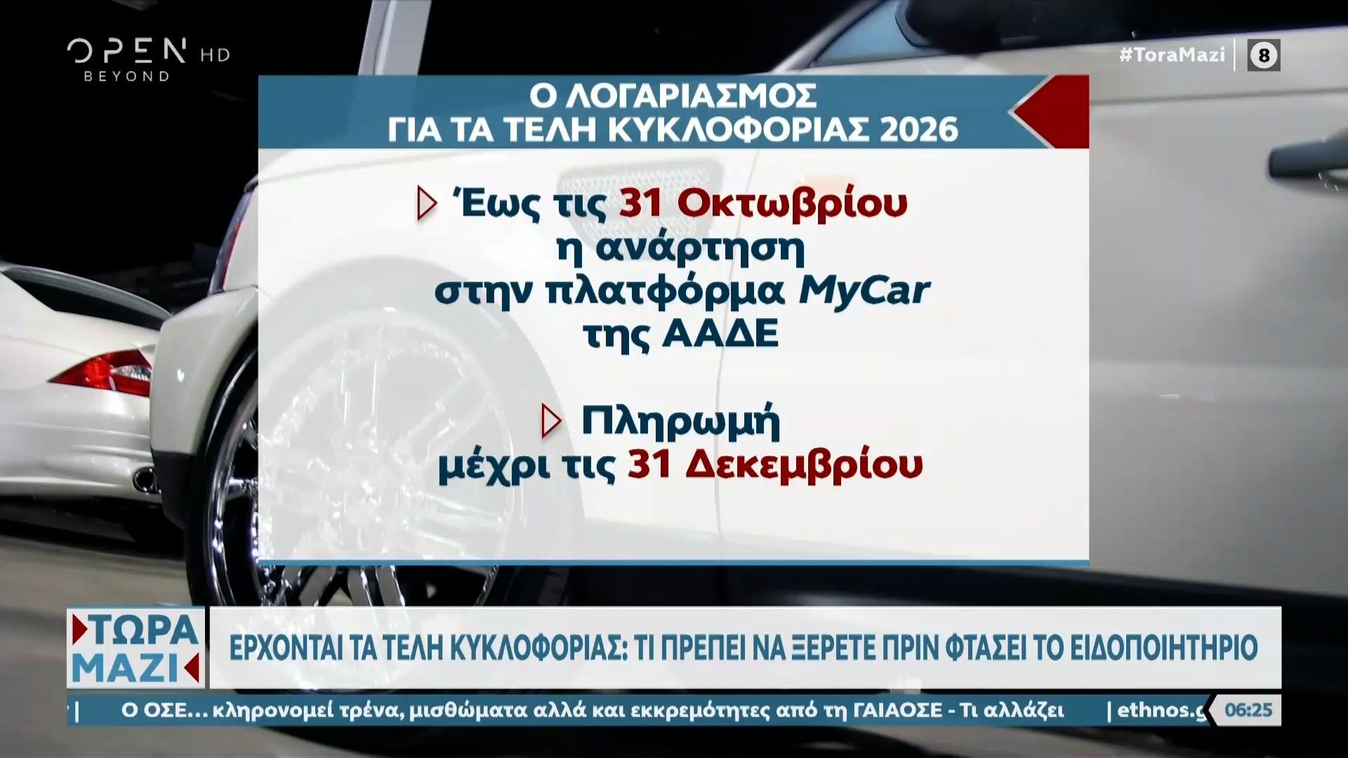 Μέχρι τις 31 Οκτωβρίου αναμένεται να αναρτηθούν τα τέλη κυκλοφορίας στην πλατφόρμα my car της ΑΑΔΕ. Οι οδηγοί θα μπορούν…