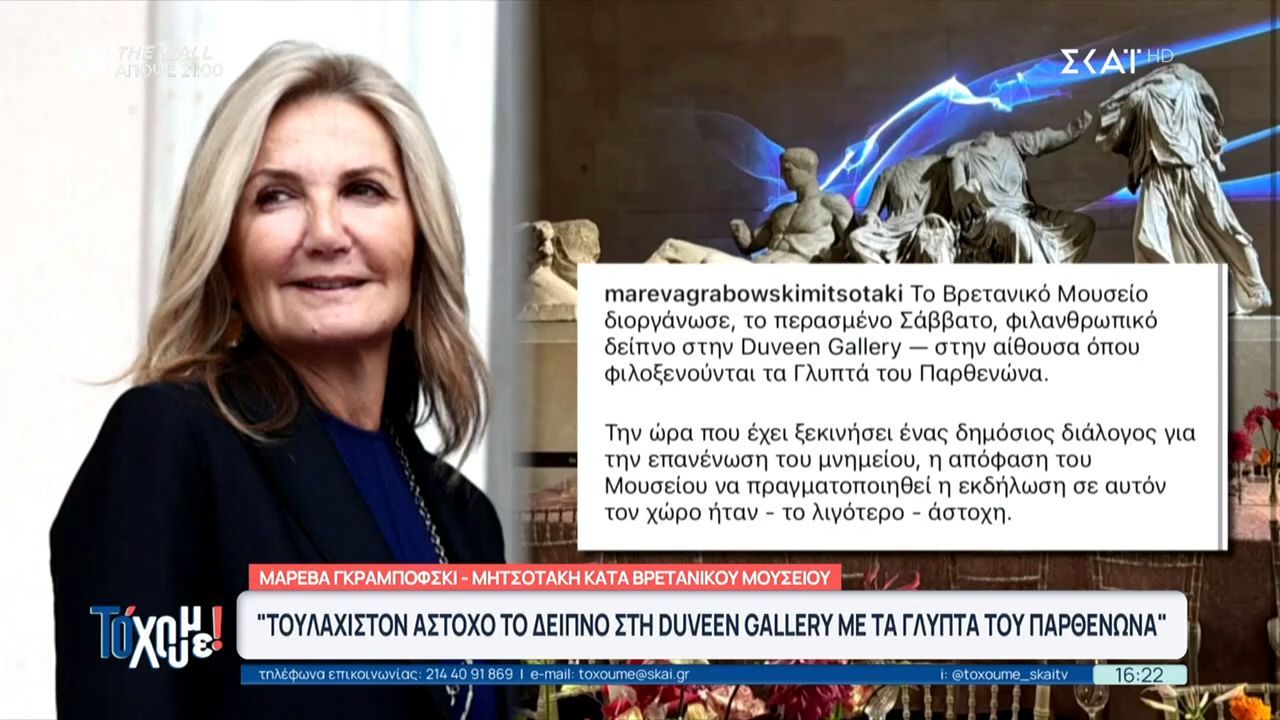 Σάλος έχει προκληθεί από το δείπνο που διοργανώθηκε στην αίθουσα γλυπτών του βρετανικού μουσείου. Η Μαρέβα Γκραμπόφσκι, σχολιάζοντας την εκδήλωση, χαρακτήρισε την επιλογή αυτή τουλάχιστον άστοχη, υπογραμμίζοντας την ακαταλληλότητα του χώρου που φιλοξενεί τα γλυπτά του Παρθενώνα.