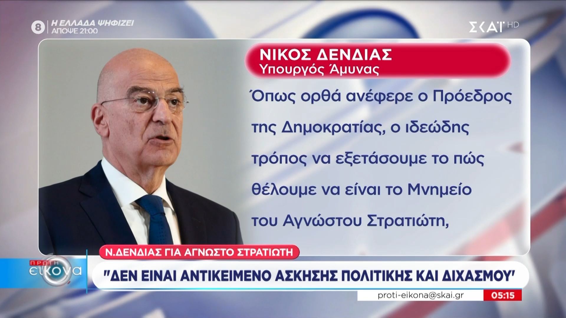 Ο υπουργός Εθνικής Άμυνας Ν. Δένδιας απουσίασε από τη Βουλή, καθώς συμμετείχε σε εκδήλωση που αφορούσε το μνημείο του Αγνώστου Στρατιώτη. Σε δηλώσεις του, τόνισε ότι το μνημείο δεν πρέπει να γίνεται αντικείμενο πολιτικής εκμετάλλευσης και διχασμού.