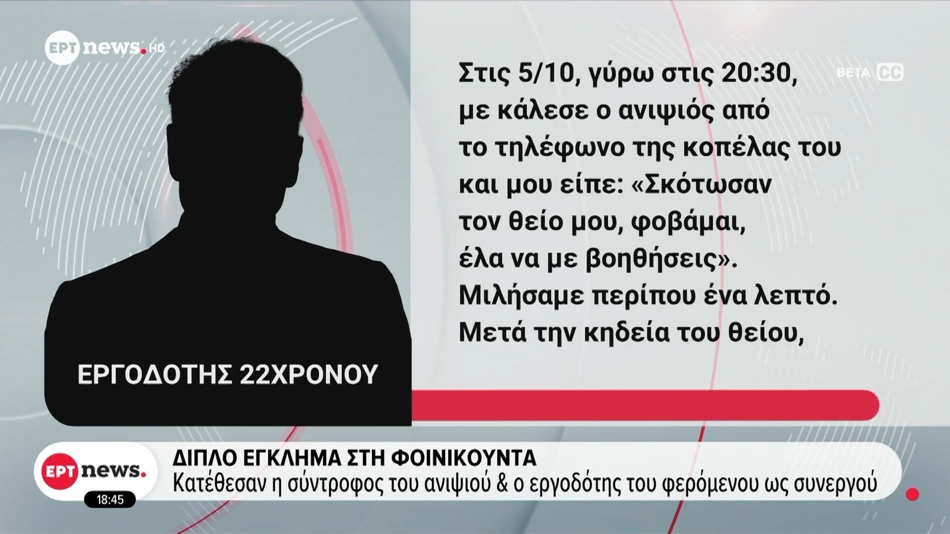 Συνεχίζονται οι αποκαλύψεις στην υπόθεση του διπλού εγκλήματος στη Φοινικούντα, καθώς η σύντροφος του ανιψιού του θύματος κατέθεσε σημαντικές πληροφορίες σχετικά με τα γεγονότα. Η κατάθεσή της αναμένεται να ρίξει φως στις σχέσεις των εμπλεκομένων και στις συνθήκες που οδήγησαν στο τραγικό συμβάν.