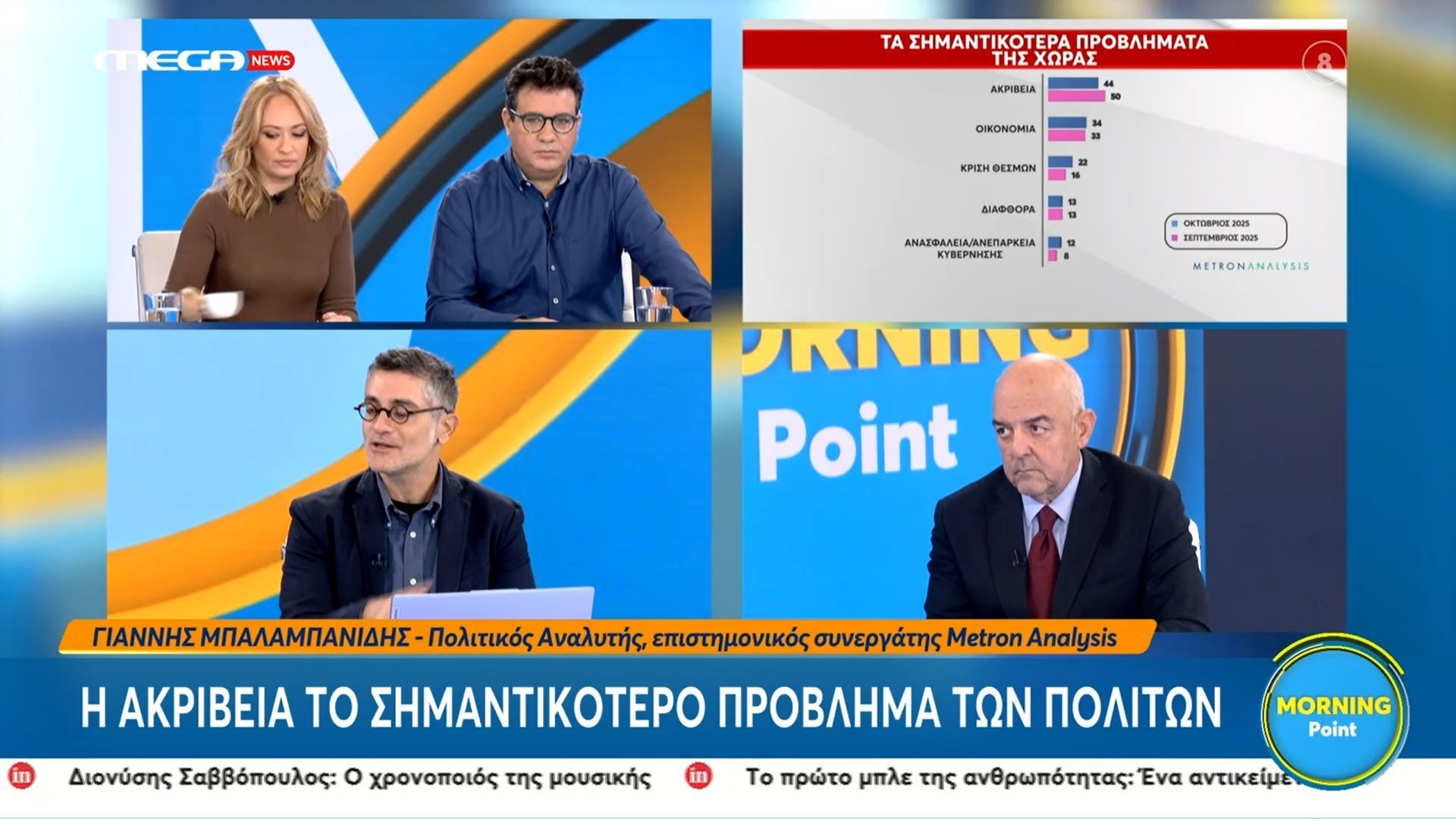 Ο πολιτικός αναλυτής Γιάννης Μπαλαμπανίδης αναλύει τα αποτελέσματα της πρόσφατης δημοσκόπησης της “Metron Analysis”, εστιάζοντας στα προβλήματα που απασχολούν τους πολίτες. Η ακρίβεια αναδεικνύεται ως το πιο επιτακτικό ζήτημα, με πολλές οικογένειες να δυσκολεύονται να καλύψουν τις βασικές τους ανάγκες.