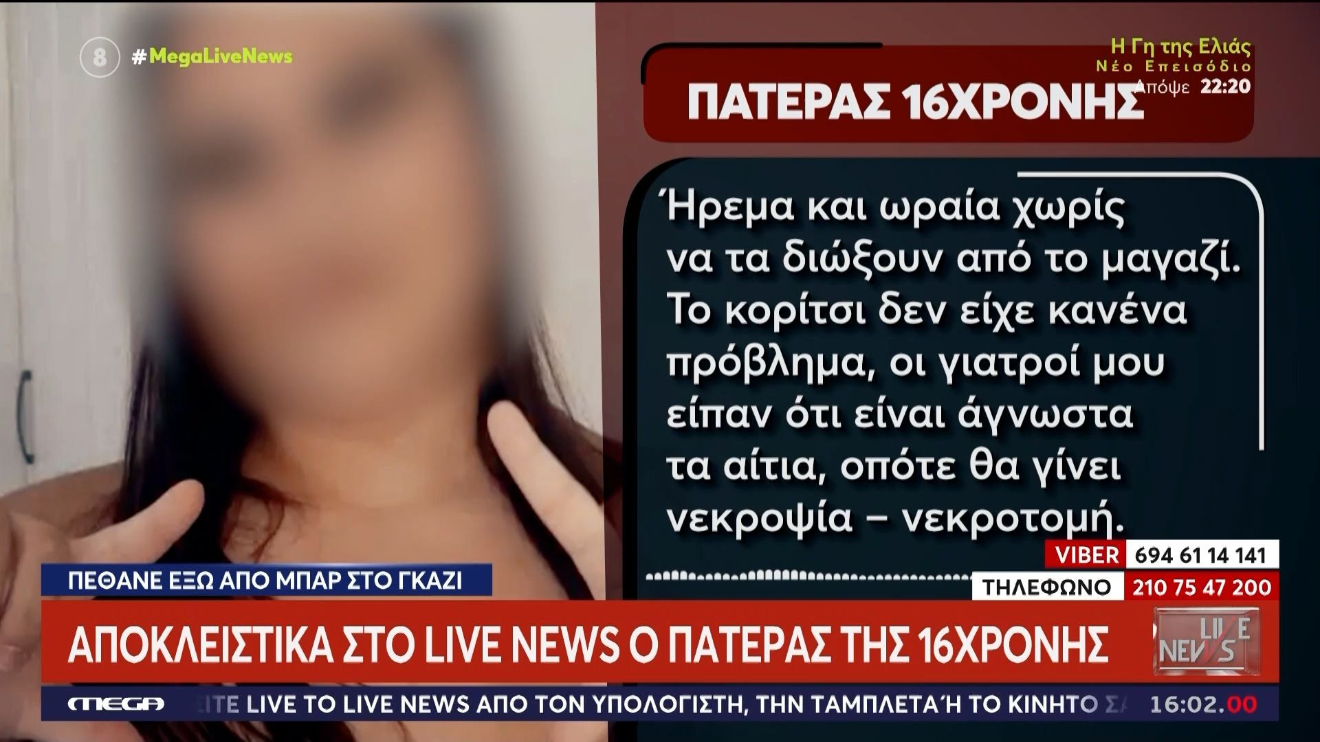 Ο πατέρας της 16χρονης κοπέλας που έχασε τη ζωή της έξω από μπαρ στο Γκάζι μιλά για την ανείπωτη τραγωδία που έχει βυθίσει την οικογένειά του στο πένθος. Εκφράζει την αδυναμία του να κατανοήσει το συμβάν και τις δυσκολίες που αντιμετωπίζει στην προσπάθεια να επεξεργαστεί την απώλεια της κόρης του.