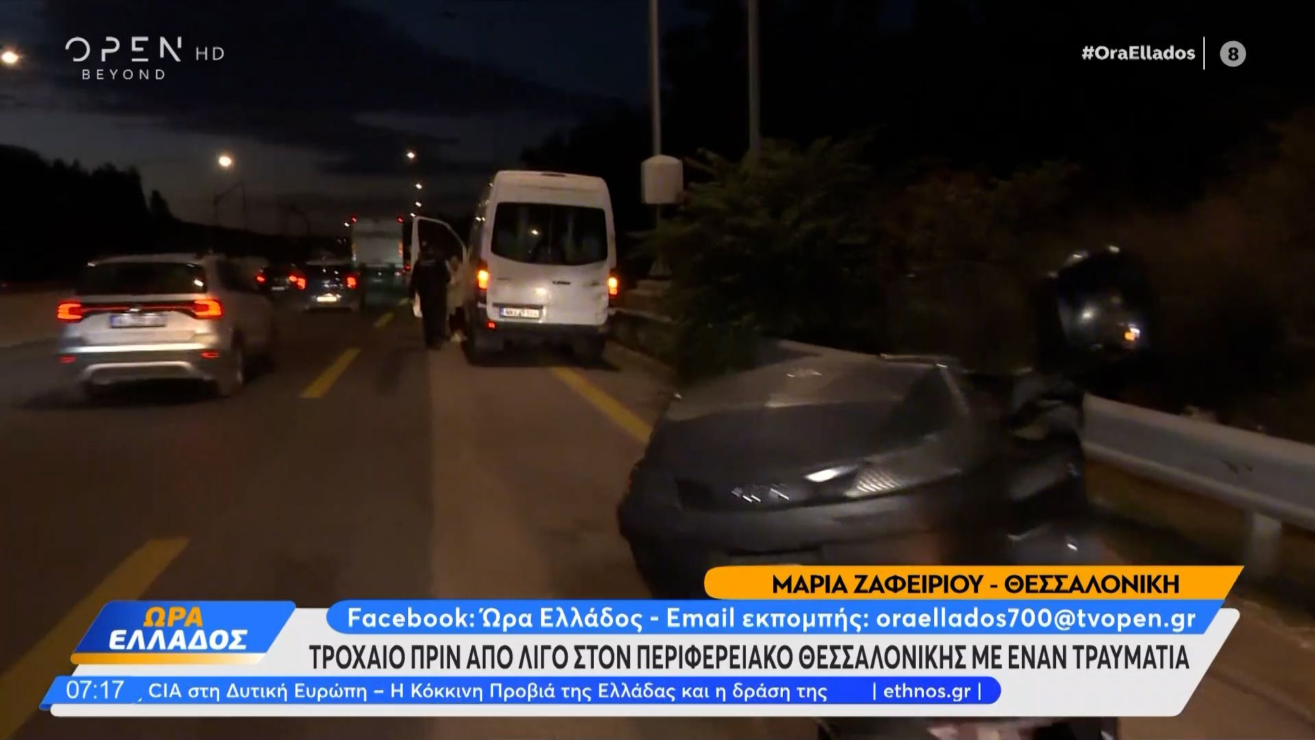 Μηχανή τυλίχτηκε στις φλόγες μετά από τροχαίο ατύχημα στην Περιφερειακή Οδό της Θεσσαλονίκης, με κατεύθυνση προς ανατολικά. Στο συμβάν εμπλέκεται ένας τραυματίας, ο οποίος μεταφέρθηκε σε κοντινό νοσοκομείο για ιατρική περίθαλψη.
