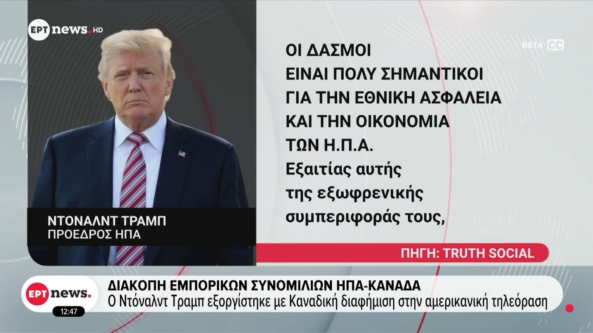 Σοβαρές εντάσεις έχουν προκύψει στις εμπορικές σχέσεις μεταξύ ΗΠΑ και Καναδά, καθώς ο πρώην πρόεδρος Ντόναλντ Τραμπ εξέφρασε την απογοήτευσή του για καναδική διαφήμιση που προβλήθηκε στην αμερικανική τηλεόραση. Η συγκεκριμένη διαφήμιση φέρεται να προσβάλλει τα συμφέροντα των ΗΠΑ, προκαλώντας την αντίδραση του Τραμπ, ο οποίος προειδοποίησε για πιθανές συνέπειες.