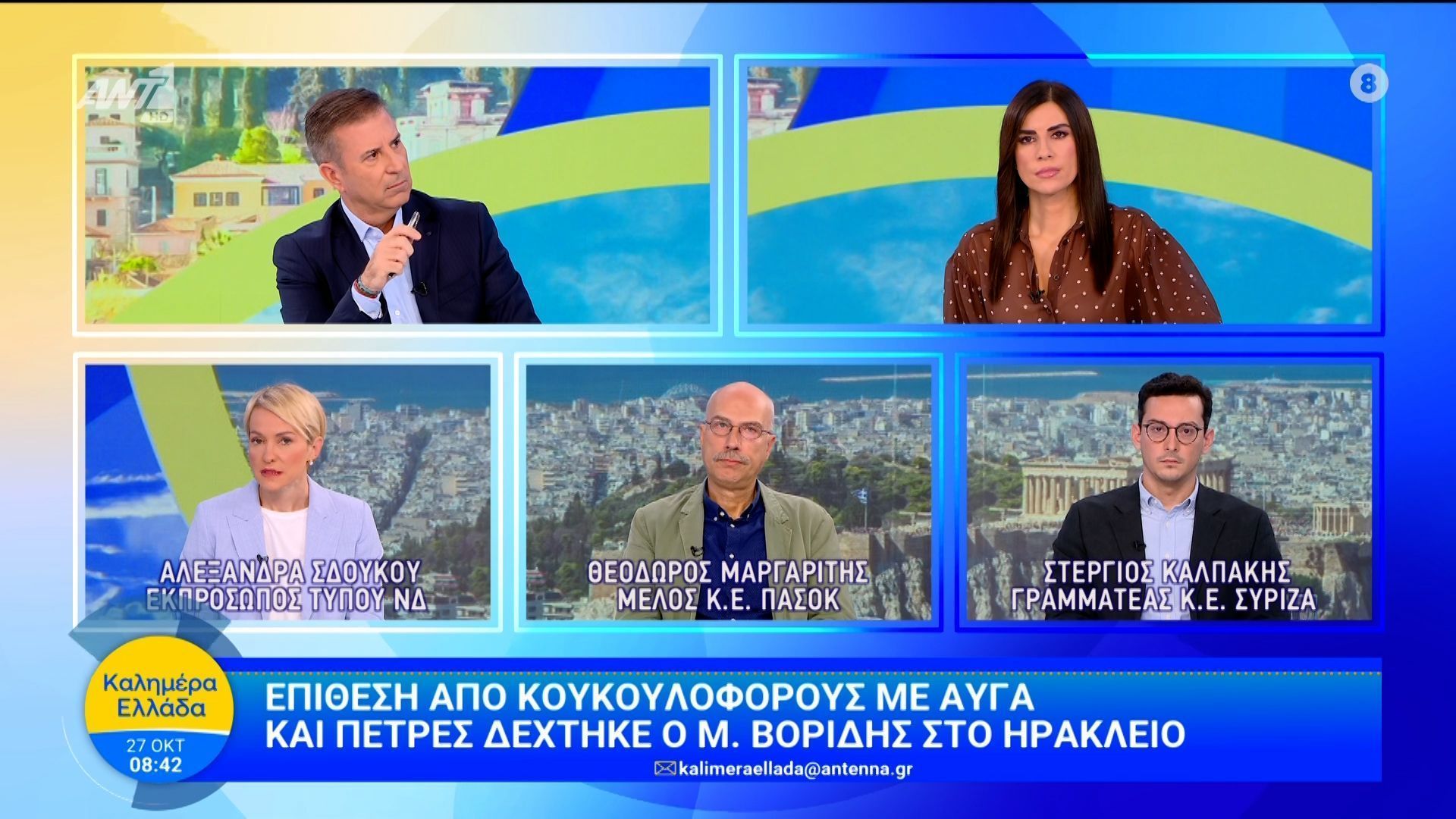 Στην εκπομπή “Καλημέρα Ελλάδα”, οι Αλεξάνδρα Σδούκου, Θεόδωρος Μαργαρίτης και Στέργιος Καλπάκης συζητούν τις αντιδράσεις που έχουν εκδηλωθεί και την ανάγκη για ψυχραιμία. Η δημόσια ασφάλεια και η πολιτική υγεία της χώρας είναι στο επίκεντρο των ανησυχιών, καθώς οι πολίτες παρακολουθούν με ανησυχία τις εξελίξεις.