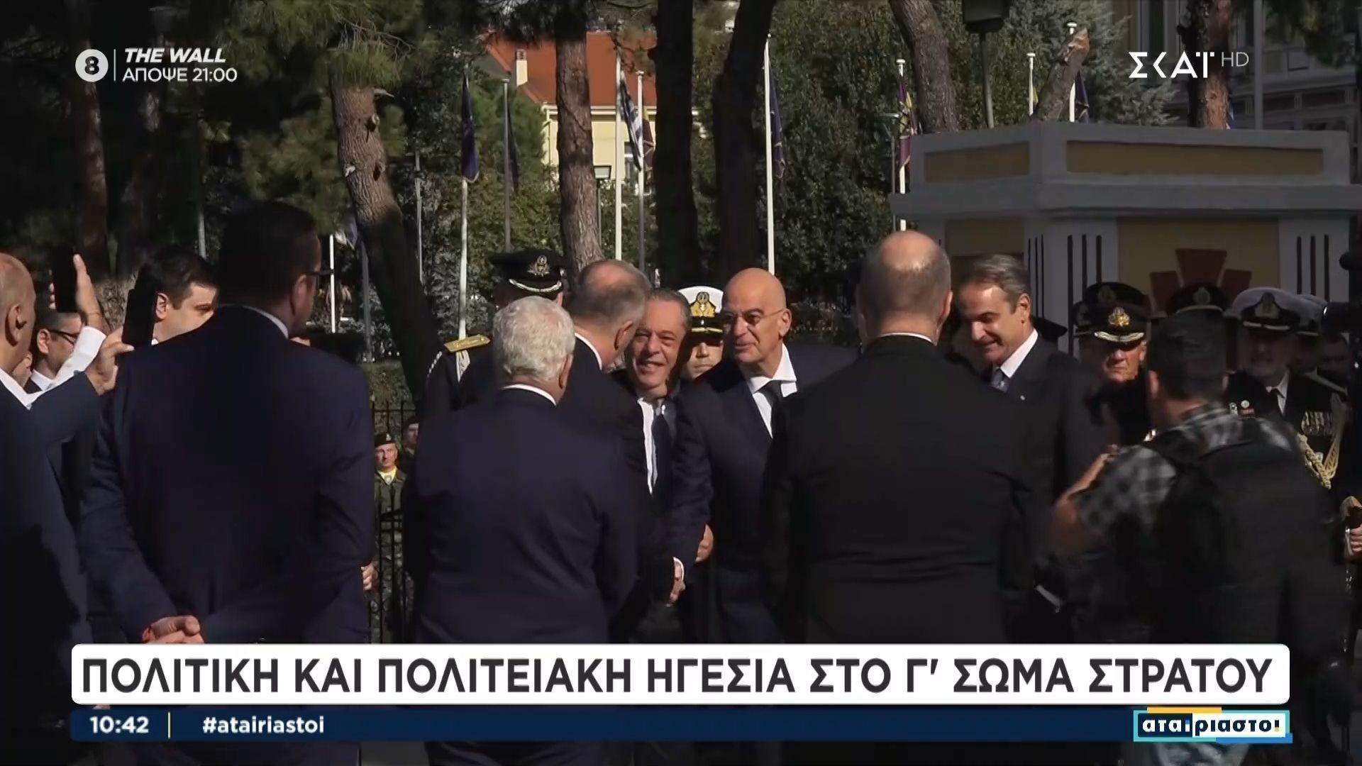 Στις εκδηλώσεις της 28ης Οκτωβρίου, η πολιτική και πολιτειακή ηγεσία συγκεντρώθηκε στο Γ’ Σώμα του Στρατού, προετοιμάζοντας τις τελευταίες λεπτομέρειες για τη στρατιωτική παρέλαση. Η χειραψία μεταξύ του Πρωθυπουργού Κυριάκου Μητσοτάκη και του Υπουργού Εξωτερικών Νίκου Δένδια αποτέλεσε σημείο αναφοράς της ημέρας, υπογραμμίζοντας την ενότητα και τη συνεργασία της κυβέρνησης.