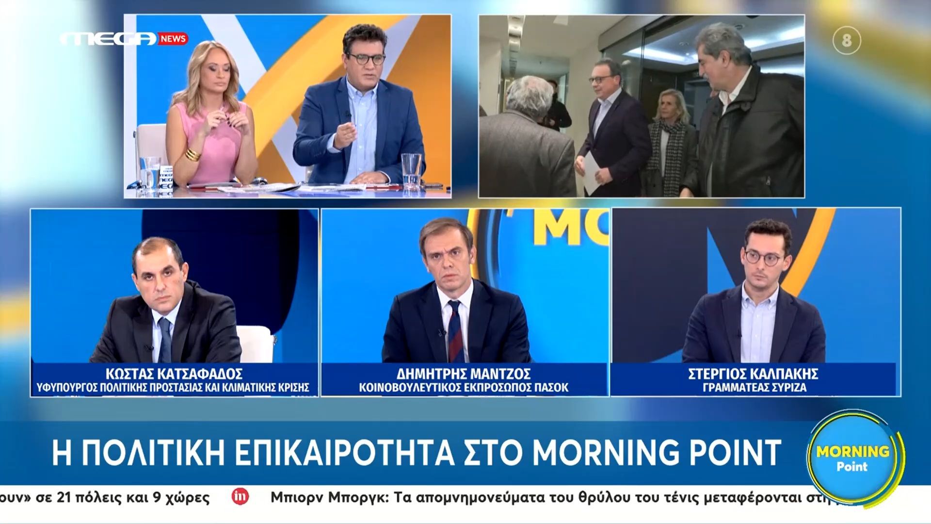 Ο Υφυπουργός Πολιτικής Προστασίας, Κώστας Κατσαφάδος, και ο Κοινοβουλευτικός Εκπρόσωπος του ΠΑΣΟΚ, Δημήτρης Μάντζος, συναντήθηκαν στην εκπομπή "Morning Point" για να συζητήσουν ζητήματα που...