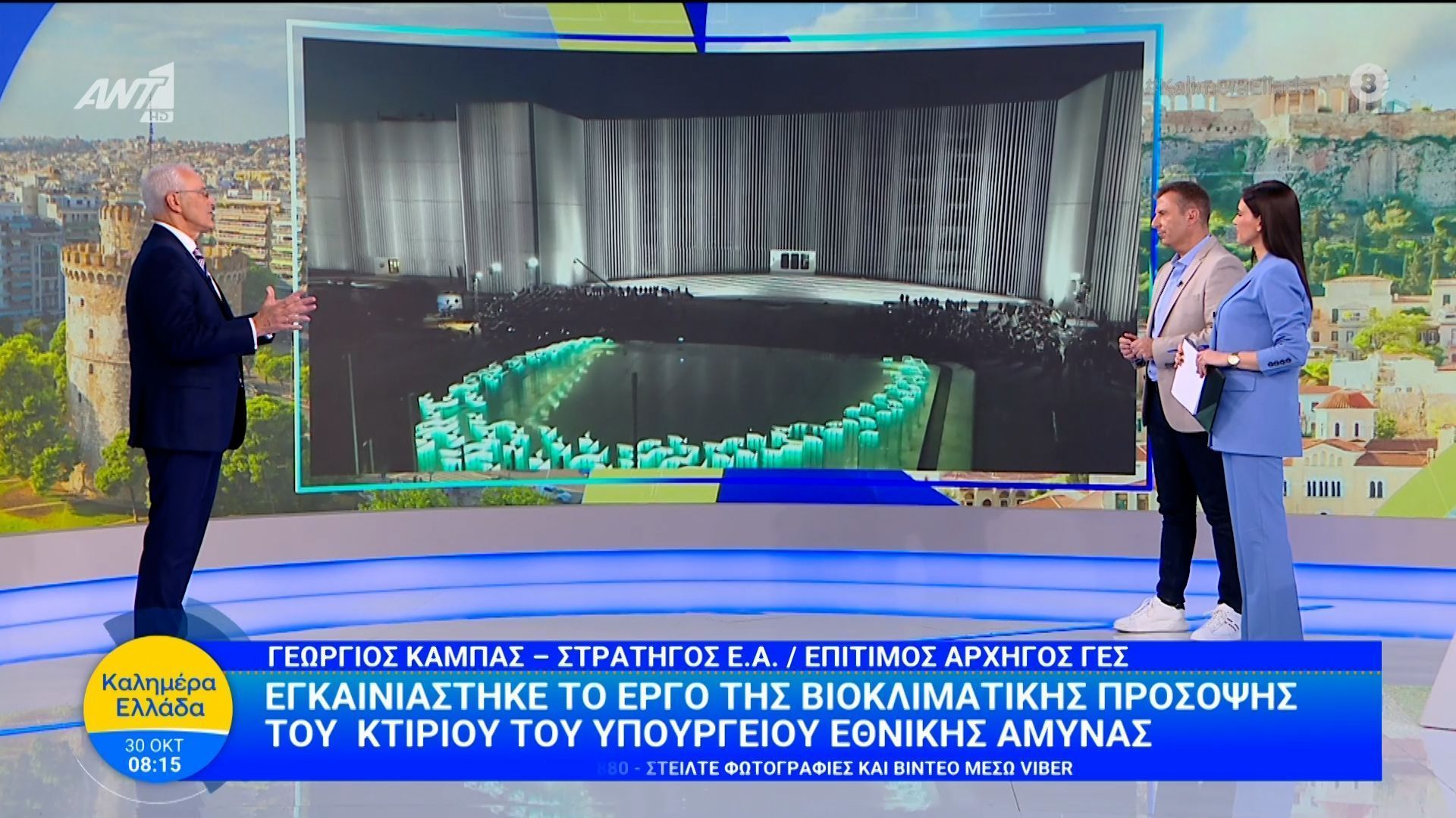 Εγκαινιάστηκε το έργο της βιοκλιματικής πρόσοψης του Υπουργείου Εθνικής Άμυνας, το οποίο στοχεύει στη μείωση της ενεργειακής κατανάλωσης και την προώθηση της βιωσιμότητας. Ο Γεώργιος Κάμπας, στρατηγός ε.α. και επίτιμος αρχηγός ΓΕΣ, αναφέρθηκε στη σημασία της πρωτοβουλίας για την ενίσχυση της περιβαλλοντικής ευαισθητοποίησης στον τομέα της άμυνας.
