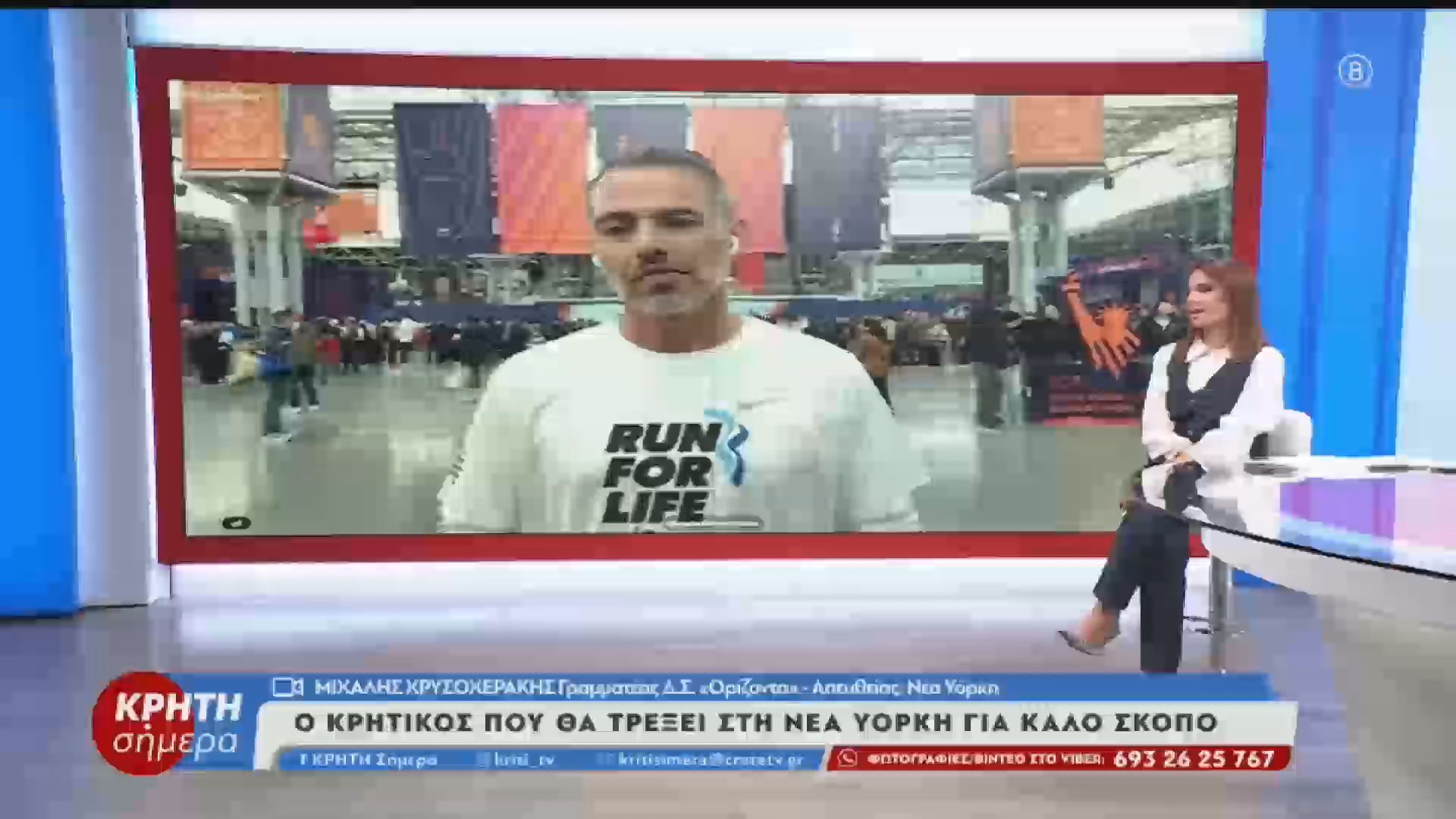 Ο Μιχάλης Χρυσοχεράκης, Γραμματέας του Συλλόγου “Ορίζοντας”, συμμετέχει στον μαραθώνιο της Νέας Υόρκης με στόχο τη συγκέντρωση χρημάτων για την αγορά δεξαμενής φύλαξης μοσχευμάτων στην Αιματολογική Κλινική του Πανεπιστημιακού Νοσοκομείου Ηρακλείου. Η πρωτοβουλία του έχει σκοπό να στηρίξει ασθενείς που χρειάζονται άμεσες ιατρικές παρεμβάσεις.