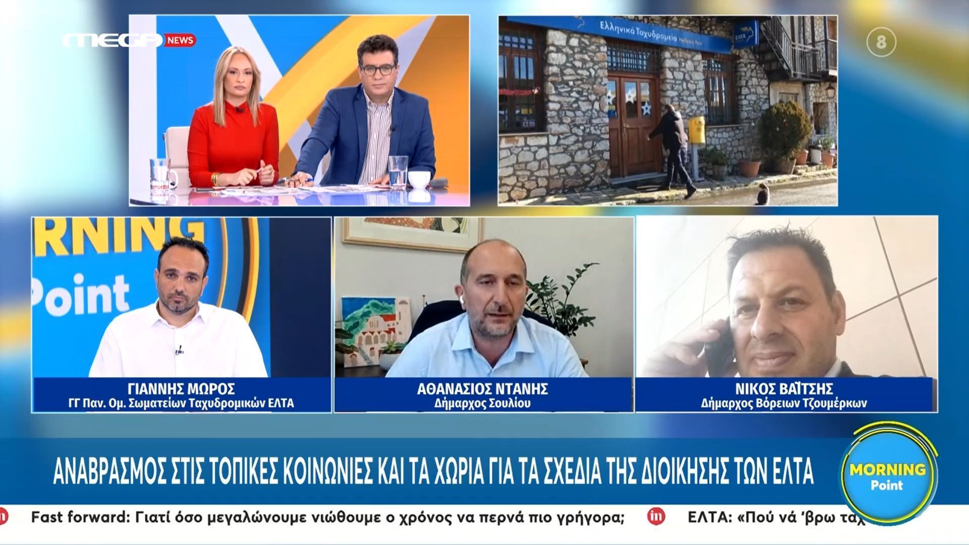 Στην εκπομπή “Morning Point”, εκπρόσωποι των τοπικών αρχών και του σωματείου των ταχυδρομικών ΕΛΤΑ συζητούν τις συνέπειες του κλεισίματος καταστημάτων στις τοπικές κοινωνίες. Ο Γιάννης Μώρος, Γραμματέας του σωματείου, αναδεικνύει τα προβλήματα που αντιμετωπίζουν οι πολίτες, ενώ οι δήμαρχοι Αθανάσιος Ντάνης και Νίκος Βαΐτσης εκφράζουν την ανησυχία τους για την παροχή υπηρεσιών.