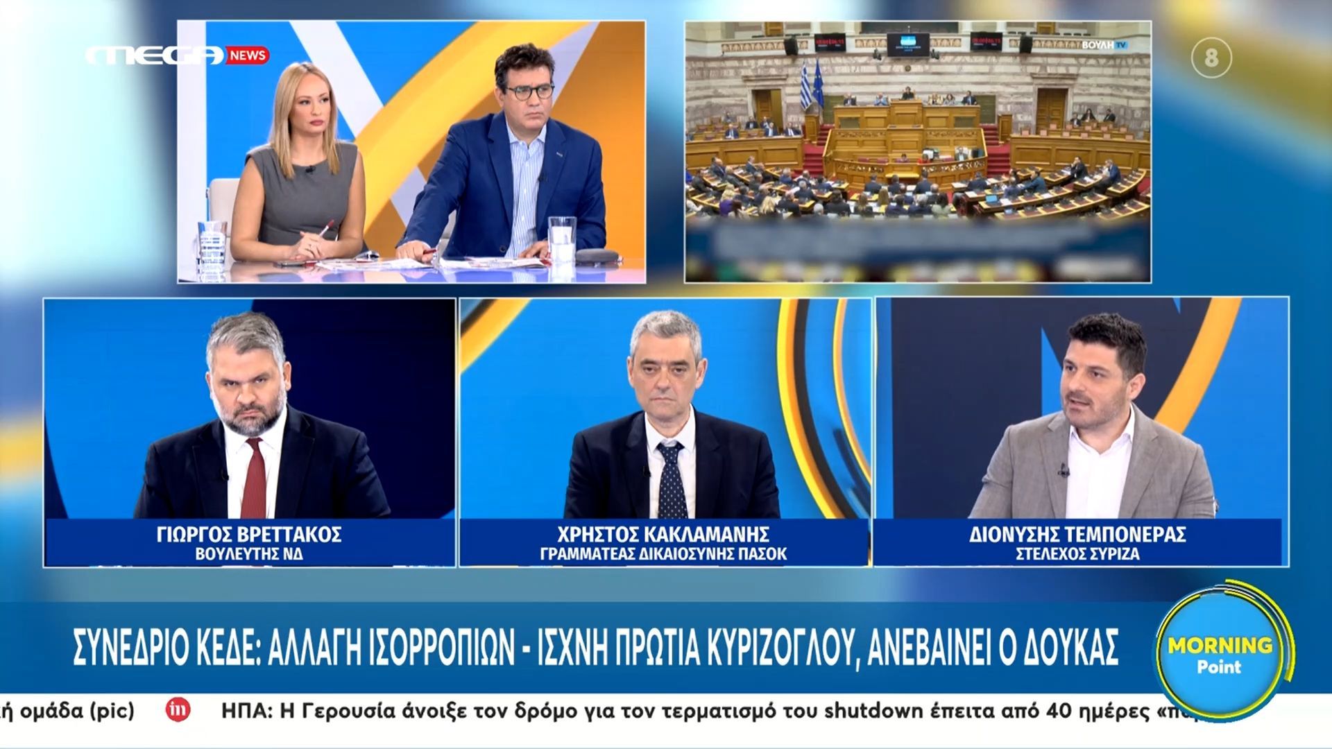 Στην εκπομπή συμμετείχαν εκπρόσωποι τριών πολιτικών κομμάτων, που παρουσίασαν τις απόψεις τους για κρίσιμα ζητήματα που απασχολούν τη χώρα. Ο Βουλευτής της ΝΔ Γιώργος Βρεττάκος, ο γραμματέας Δικαιοσύνης του ΠΑΣΟΚ Χρήστος Κακλαμάνης και το στέλεχος του ΣΥΡΙΖΑ Διονύσης Τεμπονέρας, αντάλλαξαν επιχειρήματα σχετικά με την οικονομία, τη δικαιοσύνη και την κοινωνική πολιτική.