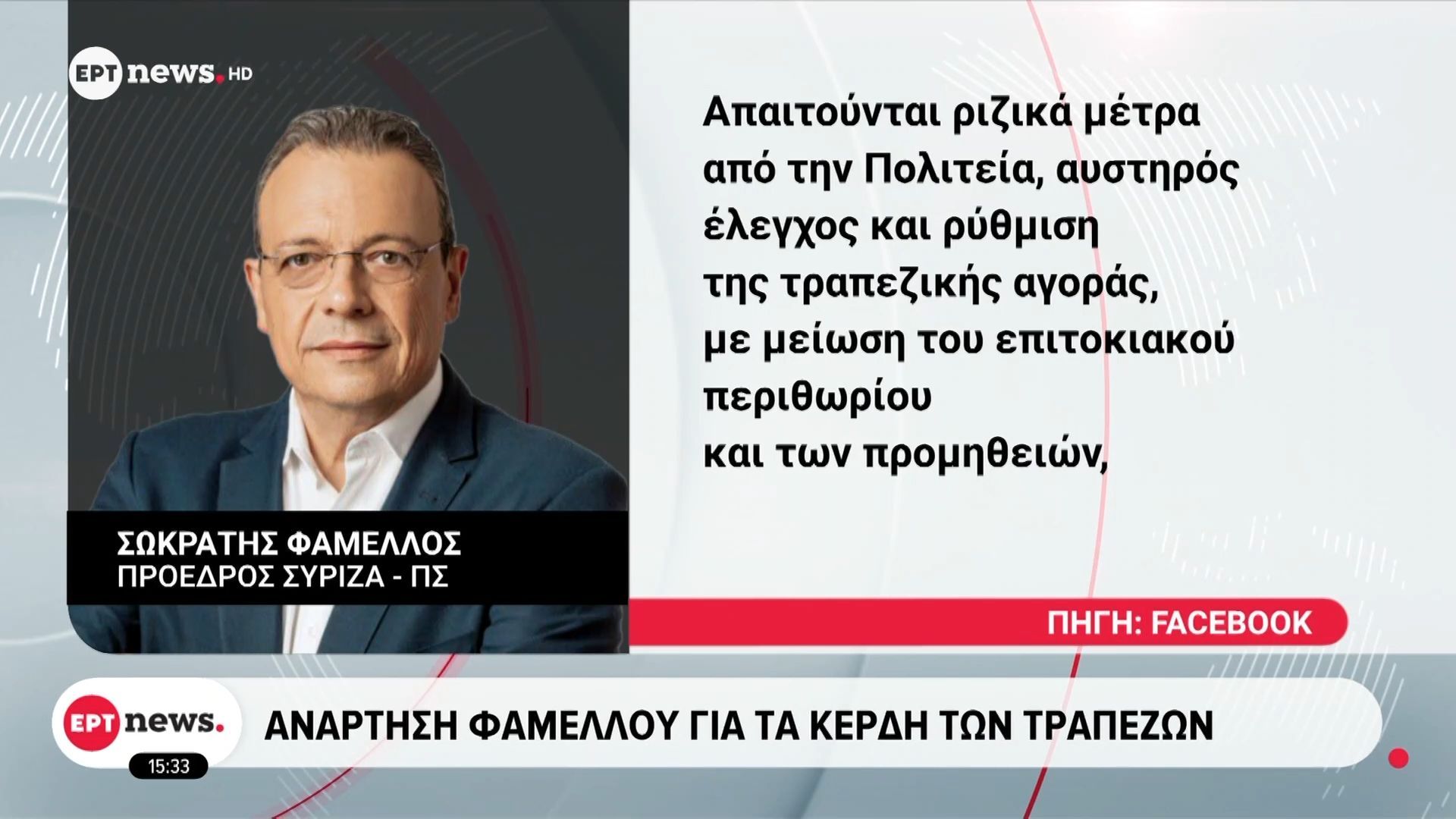 Ο Φάμελλος καταγγέλλει ότι τα υψηλά κέρδη των τραπεζών δεν αντικατοπτρίζουν την πραγματική ευρωστία της ελληνικής οικονομίας, αλλά αντίθετα προδίδουν την αφαίμαξη των νοικοκυριών. Κατά την άποψή του, η κυβέρνηση Μητσοτάκη και οι τραπεζίτες προσπαθούν να παραπλανήσουν την κοινή γνώμη σχετικά με την οικονομική κατάσταση της χώρας.