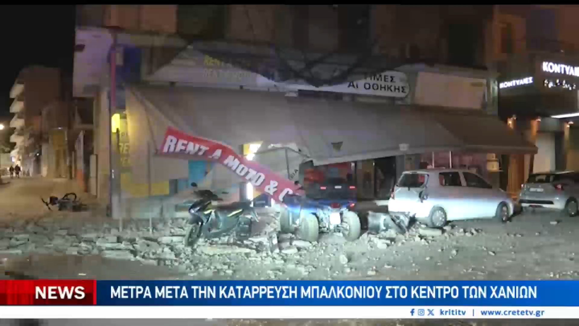 Η δημοτική αρχή Χανίων απαιτεί άμεσες ενέργειες από τον ιδιοκτήτη του κτιρίου, μετά την πτώση μπαλκονιού το περασμένο Σάββατο, που έθεσε σε κίνδυνο τη ζωή περαστικών. Ο ιδιοκτήτης καλείται να απομακρύνει τις επικίνδυνες προεξοχές και να εξασφαλίσει την ασφάλεια της περιοχής.