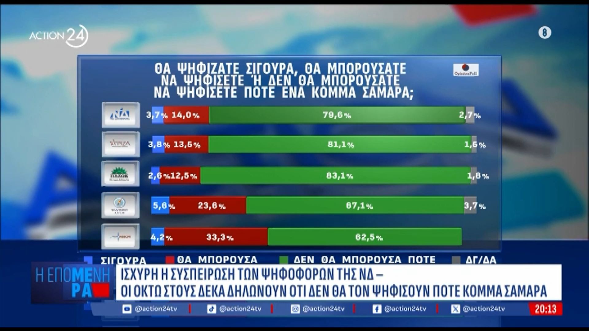 Έρευνα δείχνει ότι οι ψηφοφόροι της Νέας Δημοκρατίας διατηρούν ισχυρή συσπείρωση γύρω από το κόμμα, με το 80% αυτών να δηλώνει ότι δεν θα ψήφιζαν ποτέ τον Αντώνη Σαμαρά. Αυτή η τάση υπογραμμίζει τη σταθερότητα της κομματικής βάσης και την προτίμηση των ψηφοφόρων προς τη σημερινή ηγεσία.