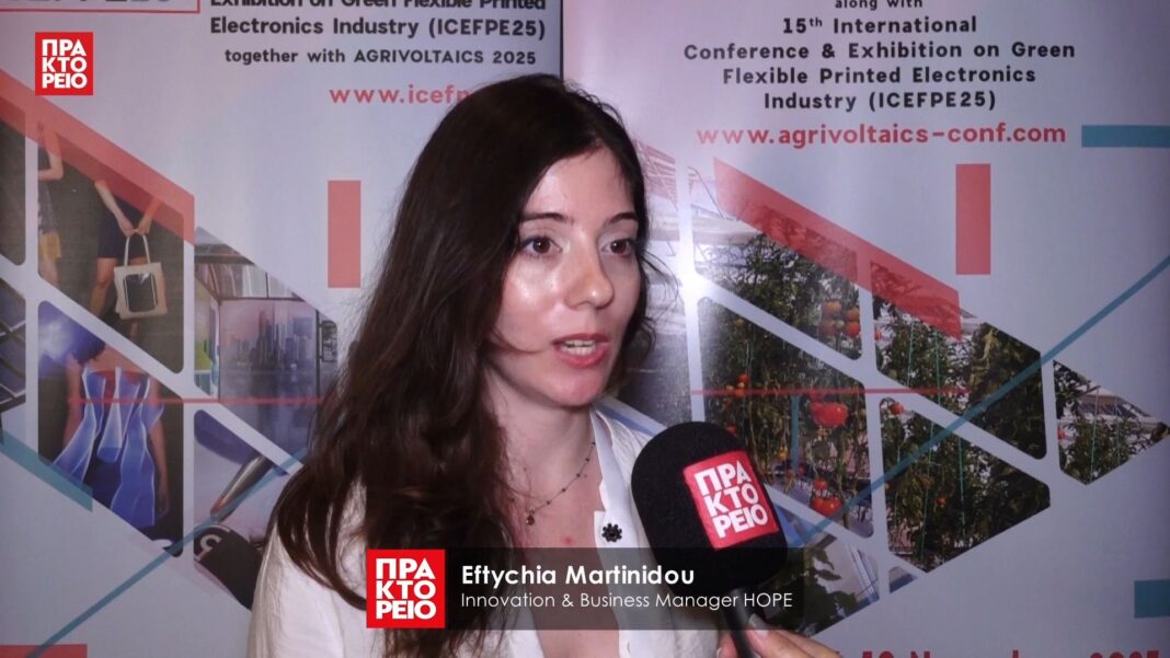 Η Eftychia Martinidou, υπεύθυνη καινοτομίας και επιχειρηματικής ανάπτυξης στην HOPE, συμμετείχε στο συνέδριο ICEFPE25 και AGRIVOLTAICS 2025, που διεξήχθη στην Αθήνα. Στη διάρκεια της ομιλίας της, αναφέρθηκε στις τελευταίες εξελίξεις στον τομέα των πράσινων ηλεκτρονικών και της αγροηλιακής ενέργειας, υπογραμμίζοντας τη σημασία της βιωσιμότητας.