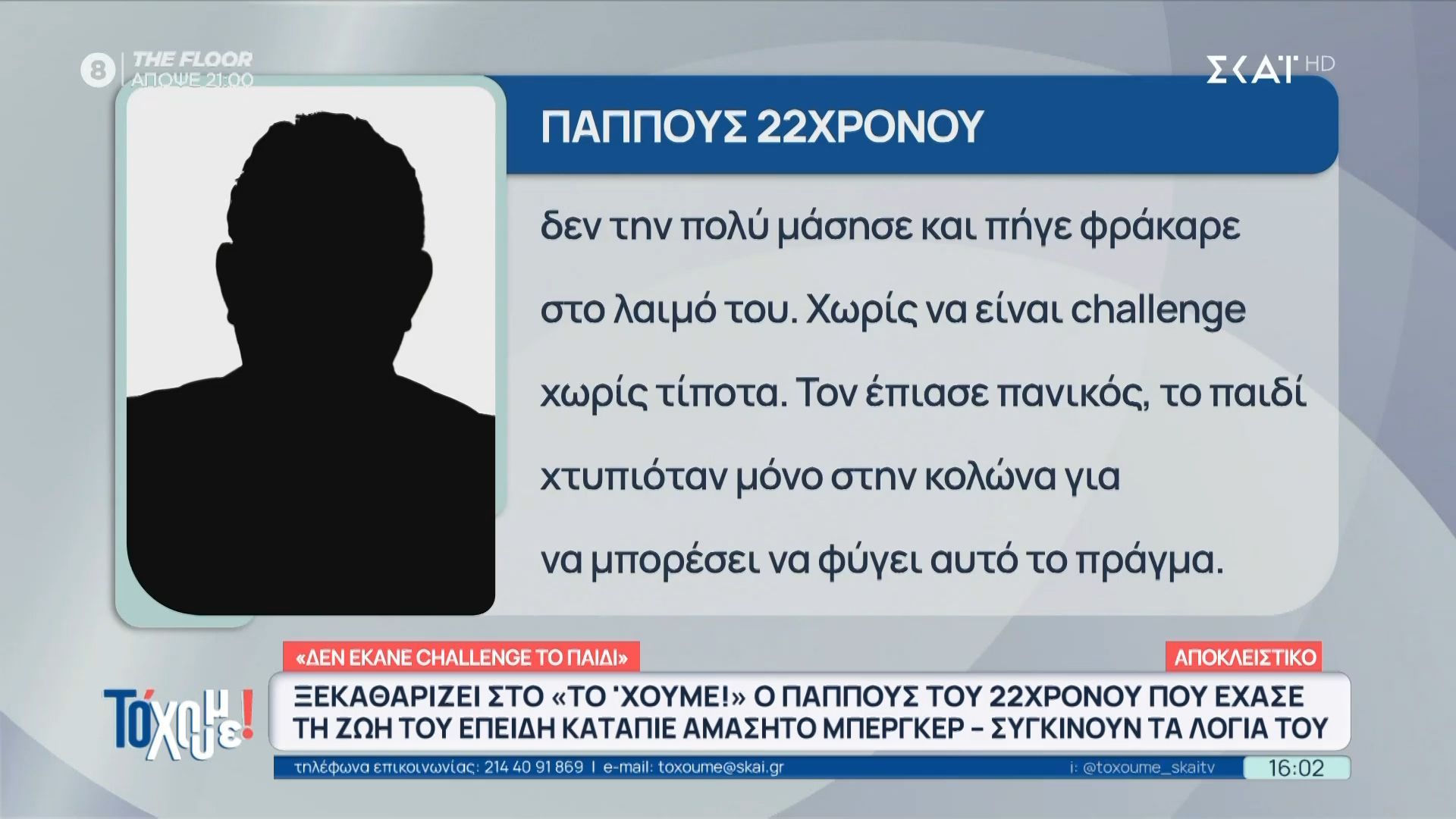 Ο παππούς του 22χρονου που tragically απεβίωσε λόγω ενός ατυχήματος με μπέργκερ, μίλησε για την απώλεια του εγγονού του σε μια συνέντευξη. Τόνισε ότι το παιδί δεν συμμετείχε σε κάποιο επικίνδυνο challenge, όπως είχε αρχικά αναφερθεί, αλλά απλώς αντιμετώπισε μια σοβαρή κατάσταση κατά την κατανάλωση του φαγητού.