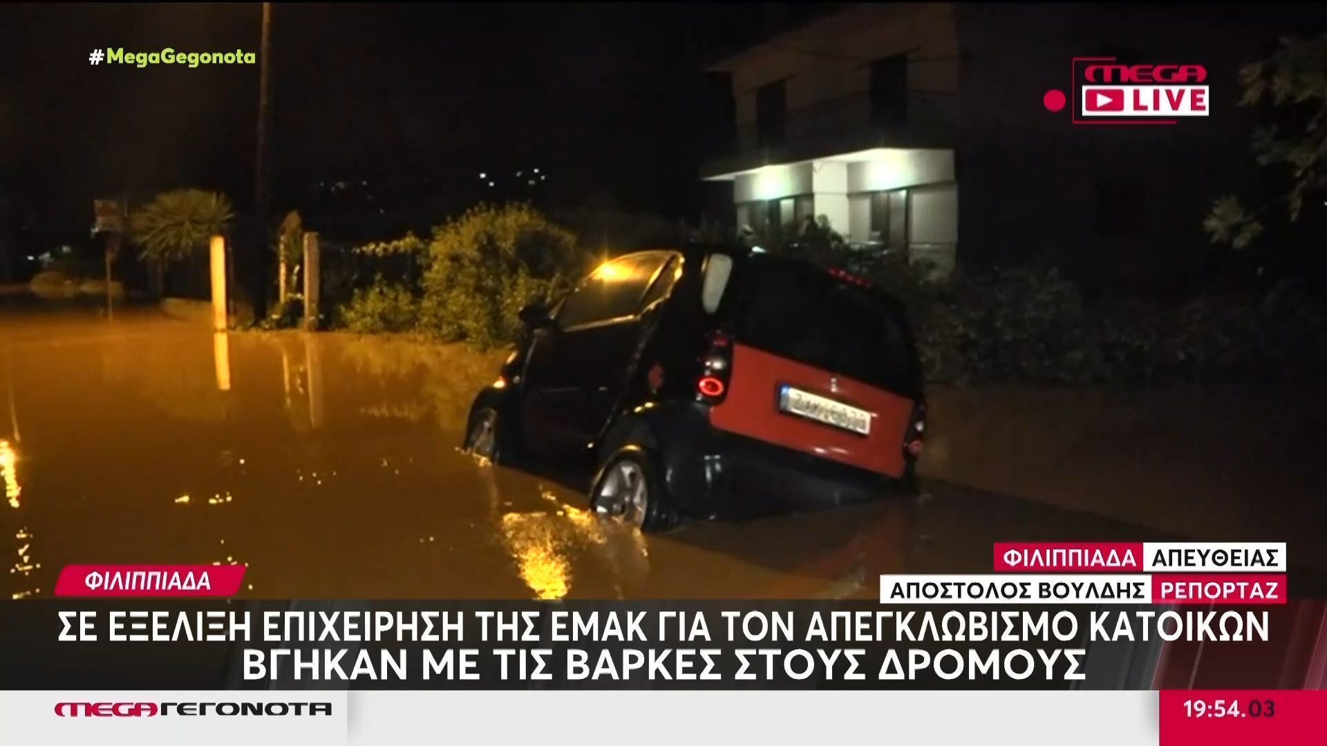 Σε κατάσταση έκτακτης ανάγκης βρίσκεται η περιοχή της Φιλιππιάδας, καθώς οι ισχυρές βροχοπτώσεις έχουν προκαλέσει σοβαρές πλημμύρες. Το νερό έχει φτάσει σε ύψος τριών με τεσσάρων μέτρων, με αποτέλεσμα οι κάτοικοι να αναγκαστούν να χρησιμοποιήσουν βάρκες για να κινηθούν στους δρόμους.