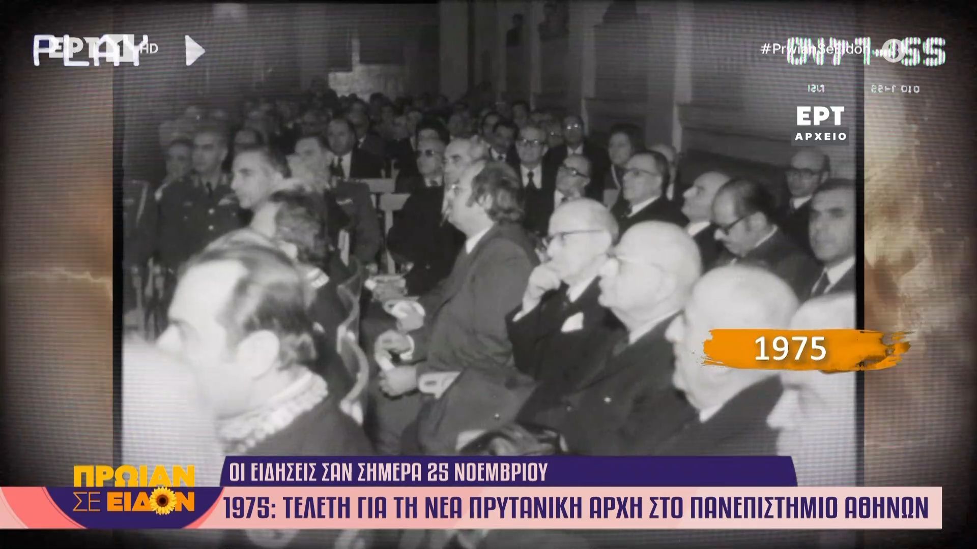 Στις 25 Νοεμβρίου 1975, πραγματοποιήθηκε η τελετή ανάληψης των καθηκόντων της νέας πρυτανικής αρχής στο Πανεπιστήμιο Αθηνών, σηματοδοτώντας μια νέα εποχή για το ίδρυμα. Η εκδήλωση συγκέντρωσε πλήθος φοιτητών, ακαδημαϊκών και επισήμων, που παρακολούθησαν με ενδιαφέρον τις ομιλίες και τις υποσχέσεις για ανανέωση και βελτίωση της πανεπιστημιακής ζωής.