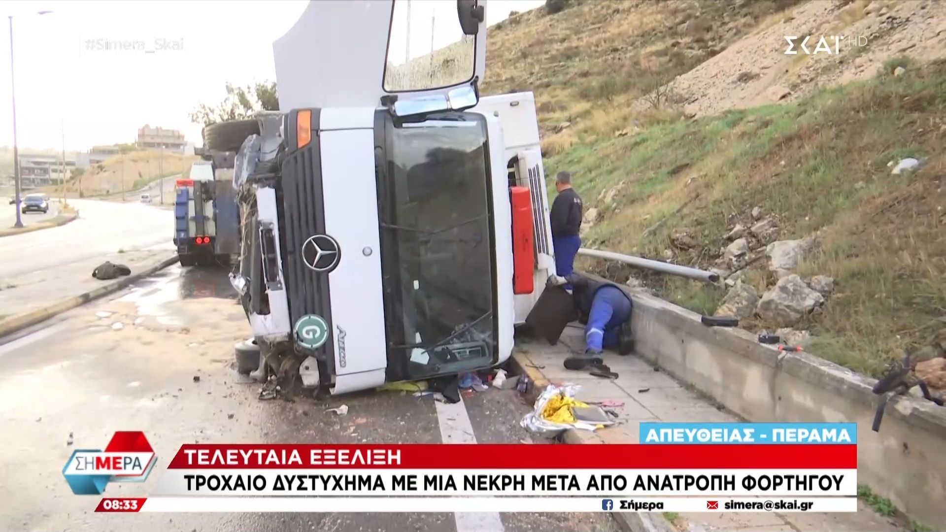 Τον έλεγχο του φορτηγού έχασε οδηγός στην περιοχή του Περάματος, με αποτέλεσμα το όχημα να ανατραπεί τα ξημερώματα της Πέμπτης. Σύμφωνα με τις πρώτες εκτιμήσεις, η ολισθηρότητα του δρόμου ενδέχεται να είναι η αιτία του ατυχήματος.
