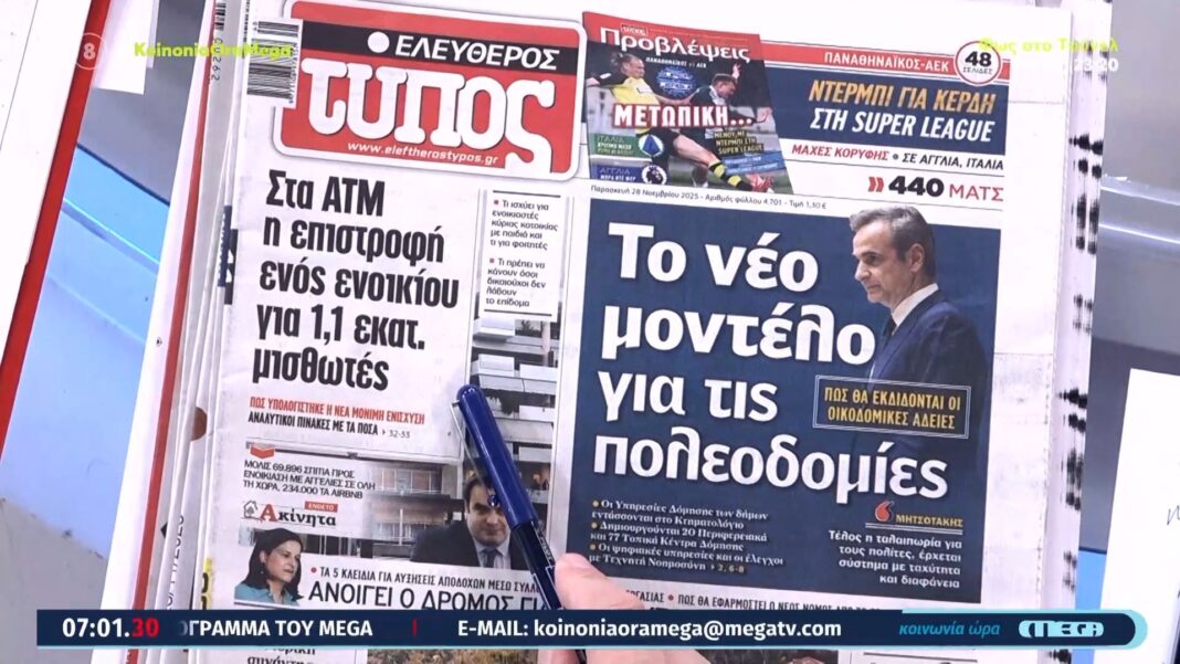 Τα πρωτοσέλιδα των εφημερίδων σήμερα 28/11/2025