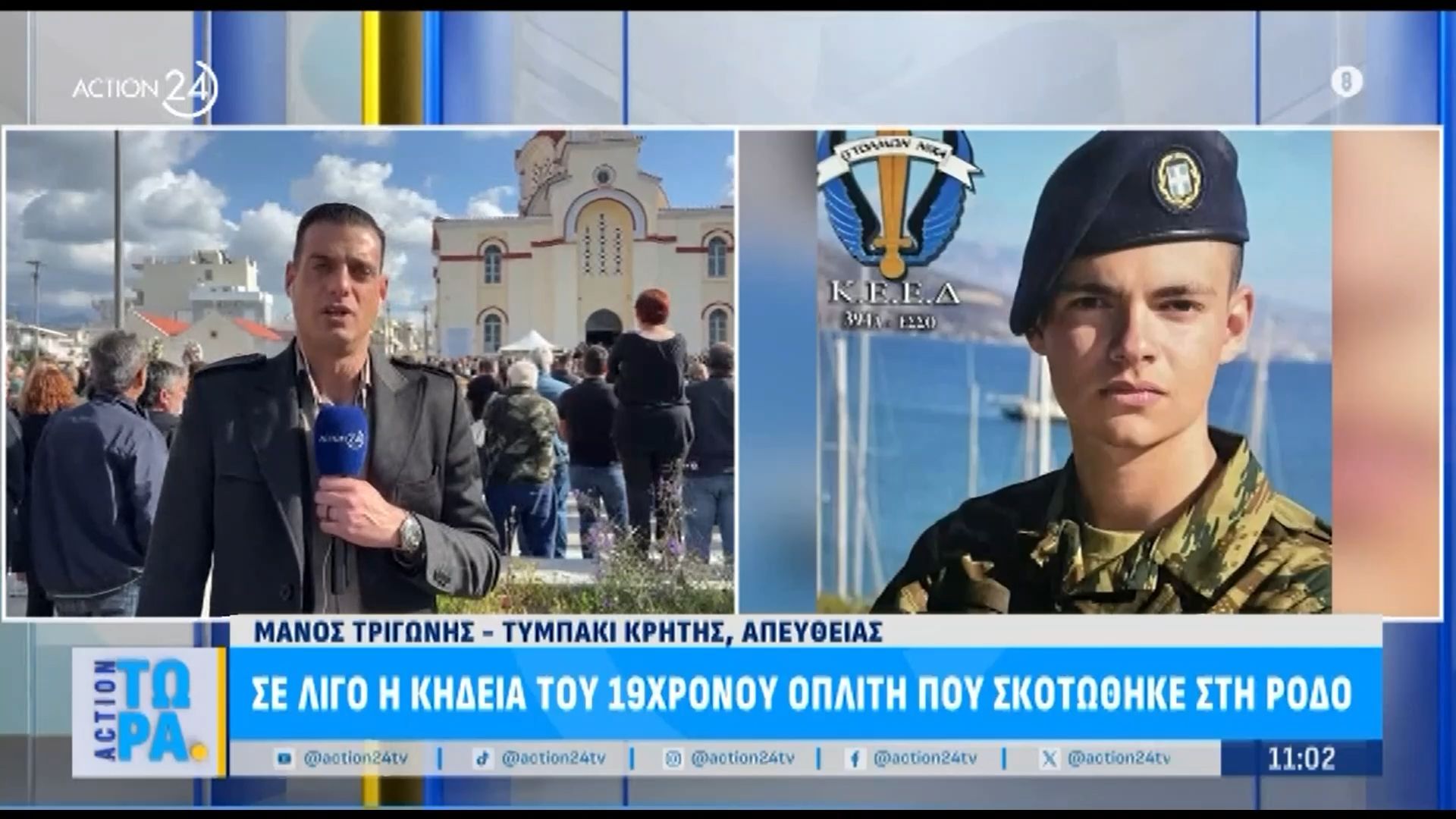 Η κηδεία του 19χρονου οπλίτη που tragically σκοτώθηκε στη Ρόδο από έκρηξη χειροβομβίδας πραγματοποιείται σήμερα στο Τιμπάκι της Κρήτης. Η είδηση του θανάτου του έχει προκαλέσει θλίψη στην τοπική κοινωνία και στις ένοπλες δυνάμεις, όπου υπηρετούσε με αφοσίωση.