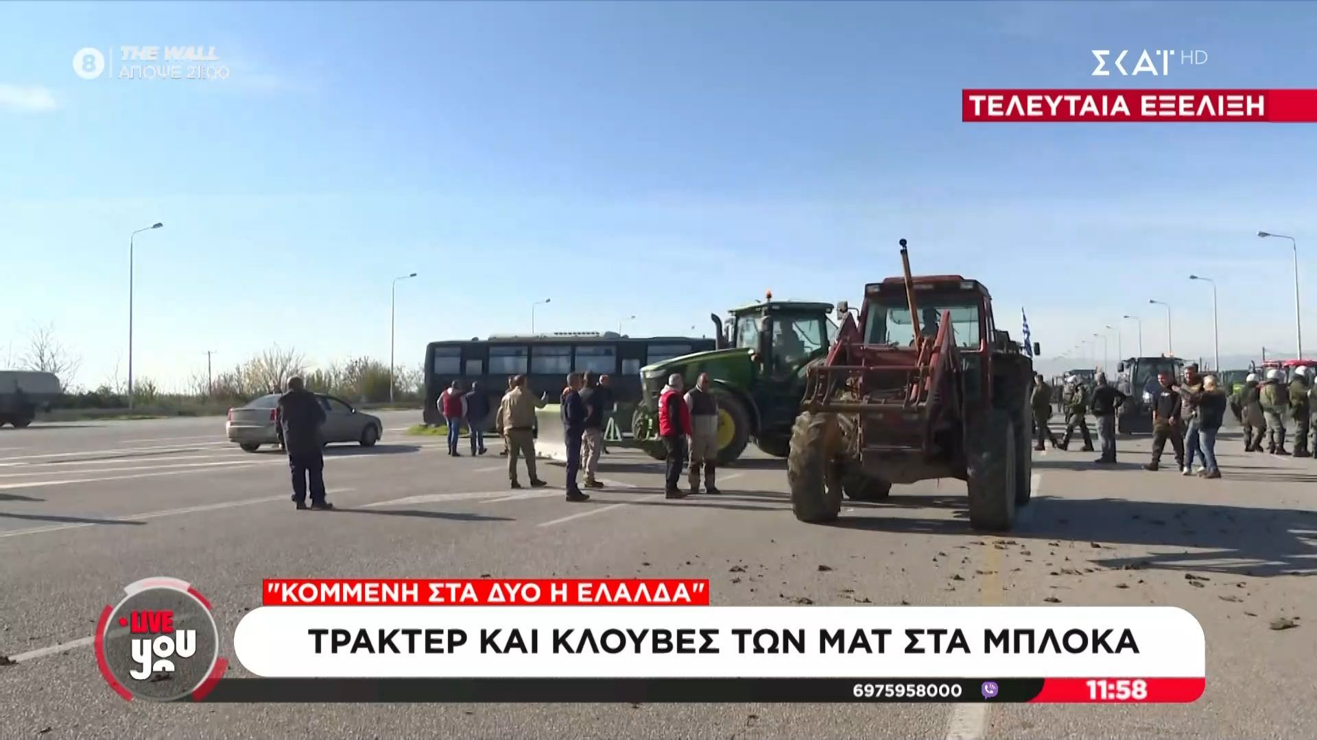 Τρακτέρ και κλούβες των ΜΑΤ έχουν παραταχθεί στα μπλόκα των αγροτών, οι οποίοι προχώρησαν σε αιφνιδιαστικές κινητοποιήσεις. Αυτή τη στιγμή, η Εθνική Οδός είναι κλειστή, προκαλώντας σημαντικές καθυστερήσεις στην κυκλοφορία.