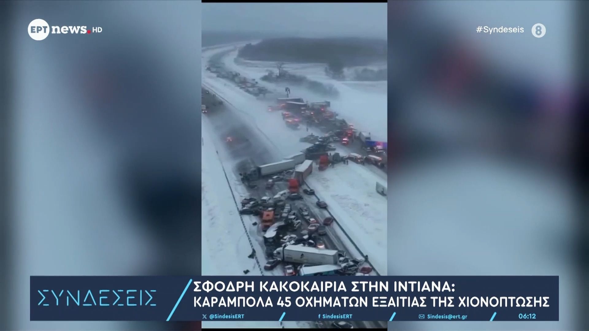 Σφοδρές χιονοπτώσεις πλήττουν την Ιντιάνα, προκαλώντας σοβαρές κυκλοφοριακές αναταραχές. Μια καραμπόλα που περιλάμβανε 45 οχήματα σημειώθηκε σε κεντρικό δρόμο, με αποτέλεσμα να υπάρξουν τραυματισμοί και σημαντικές υλικές ζημιές.