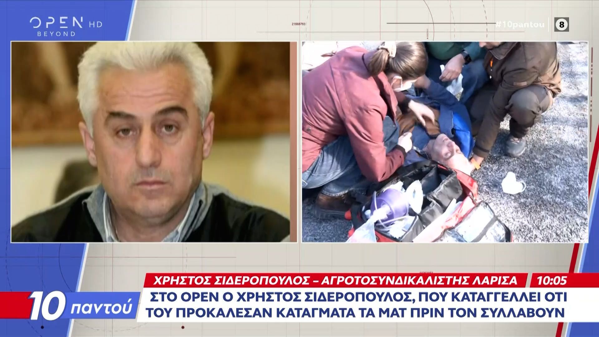 Ο αγροτοσυνδικαλιστής Χρήστος Σιδερόπουλος καταγγέλλει ότι υπέστη σοβαρούς τραυματισμούς, συγκεκριμένα κάταγμα στα πλευρά, κατά τη διάρκεια επεισοδίου με τις δυνάμεις της αστυνομίας. Σύμφωνα με τον ίδιο, η επίθεση προήλθε από αξιωματικό της Αστυνομίας πριν από τη σύλληψή του, γεγονός που έχει προκαλέσει έντονες αντιδράσεις.