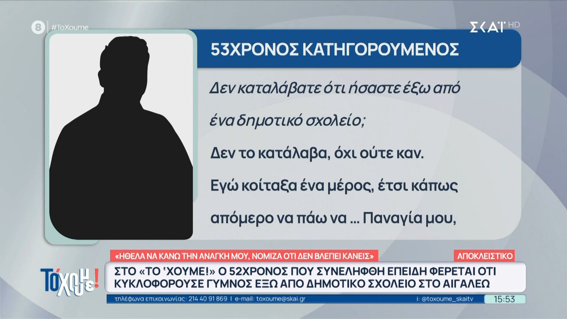 Συνελήφθη ένας 52χρονος άνδρας στο Αιγάλεω, ο οποίος εντοπίστηκε να κυκλοφορεί γυμνός κοντά σε δημοτικό σχολείο. Ο συλληφθείς δήλωσε ότι επιχείρησε να καλύψει μια φυσική ανάγκη, πιστεύοντας ότι δεν τον παρατηρούσε κανείς.