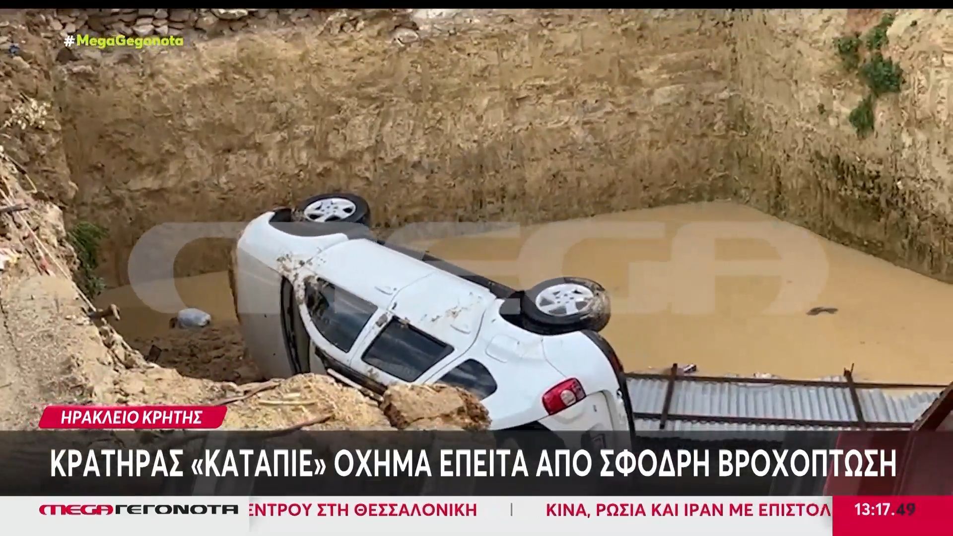 Δραματική υποχώρηση οδοστρώματος στο Ηράκλειο λόγω ισχυρής βροχής, με σταθμευμένο όχημα να βυθίζεται στον κρατήρα που δημιουργήθηκε