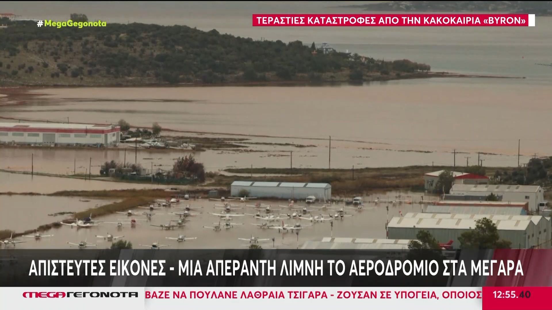 Τεράστιες καταστροφές προκλήθηκαν από την κακοκαιρία «Byron», με το αεροδρόμιο στα Μέγαρα να μετατρέπεται σε απέραντη λίμνη. Η έντονη βροχόπτωση και οι ισχυροί άνεμοι έχουν προκαλέσει σοβαρές ζημιές στις υποδομές και τις εγκαταστάσεις, με αποτέλεσμα να διακοπεί η λειτουργία του.