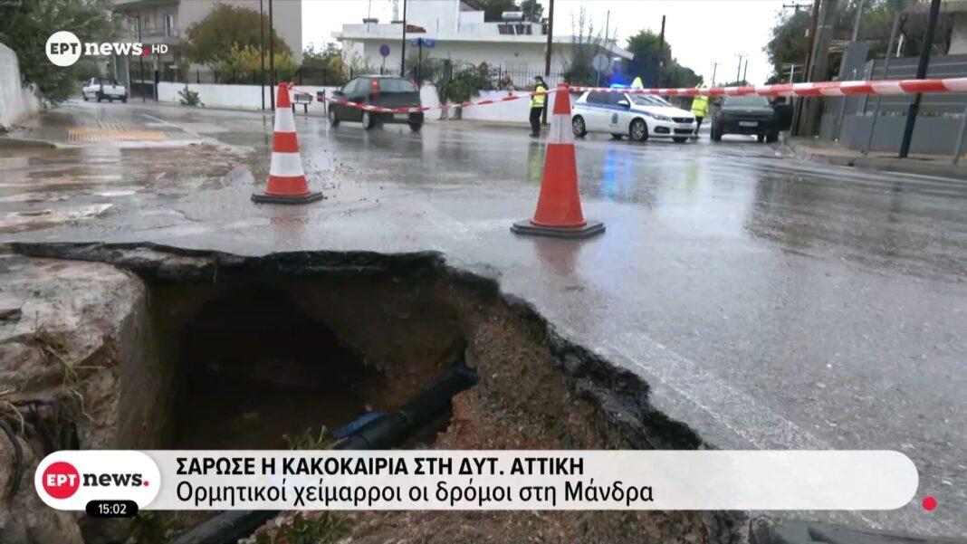 Έντονη κακοκαιρία πλήττει τη Μάνδρα με ακραία φαινόμενα, προκαλώντας πλημμύρες και μετατρέποντας τους δρόμους σε επικίνδυνους χείμαρρους