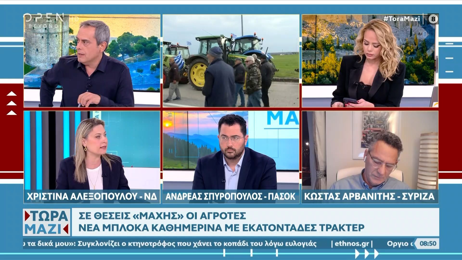 Στην εκπομπή, οι Χριστίνα Αλεξοπούλου, Ανδρέας Σπυρόπουλος και Κώστας Αρβανίτης αντάλλαξαν απόψεις σχετικά με τις αυξανόμενες κινητοποιήσεις των αγροτών. Οι συμμετέχοντες ανέδειξαν τα αιτήματα των αγροτών και τις προκλήσεις που αντιμετωπίζουν, καθώς τα μπλόκα επηρεάζουν την κυκλοφορία και τη ζωή στις τοπικές κοινωνίες.