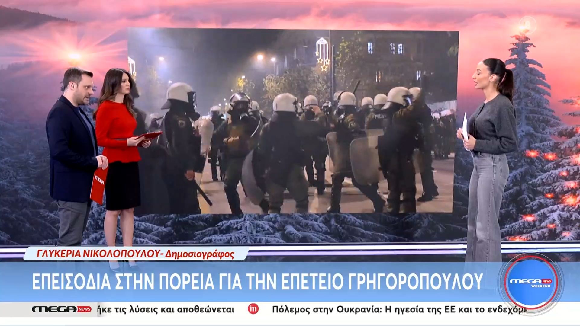 Έντονα επεισόδια σημειώθηκαν κατά τη διάρκεια της πορείας για την επέτειο της δολοφονίας του Αλέξανδρου Γρηγορόπουλου, με πλήθος διαδηλωτών να διαμαρτύρονται φωνάζοντας συνθήματα. Οι δυνάμεις των ΜΑΤ αντέδρασαν με ρίψεις χημικών και χρήση βίας, προκαλώντας ένταση στην περιοχή.