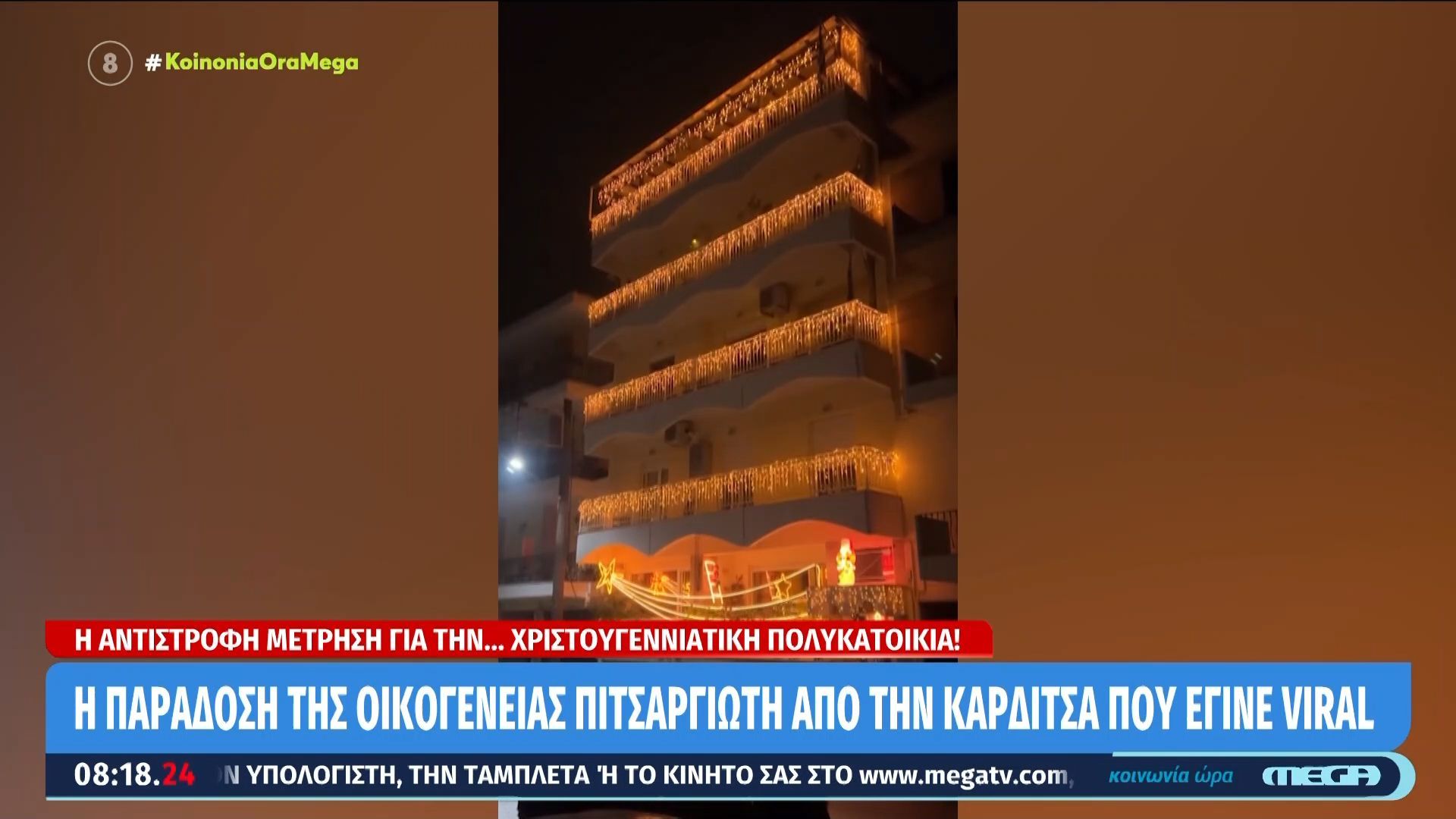 Η οικογένεια Πιτσαργιώτη από την Καρδίτσα έχει καθιερώσει μια μοναδική παράδοση, μετατρέποντας το σπίτι τους σε ένα εντυπωσιακό χριστουγεννιάτικο θέαμα που έχει καταφέρει να κλέψει τις καρδιές των κατοίκων και των επισκεπτών. Κάθε χρόνο, η αντίστροφη μέτρηση για την αποκάλυψη της φωτισμένης πολυκατοικίας δημιουργεί μια ατμόσφαιρα γιορτής και ενθουσιασμού στην τοπική κοινότητα.