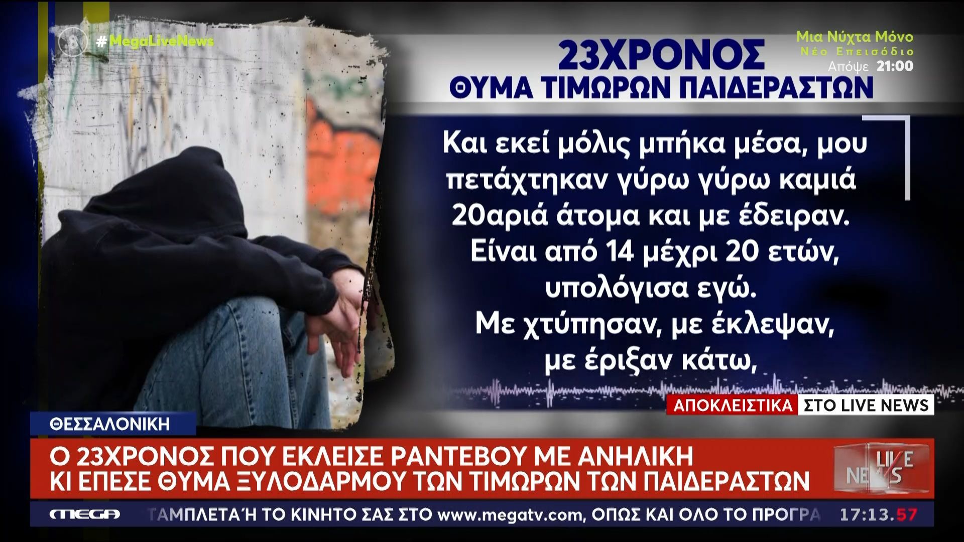 Ένας 23χρονος άνδρας, που έκλεισε ραντεβού με ανήλικη, έγινε θύμα βίας από ομάδα που αυτοαποκαλείται «τιμωροί των παιδεραστών». Ο νεαρός περιγράφει την τρομακτική εμπειρία του και τις συνθήκες κάτω από τις οποίες υπέστη ξυλοδαρμό.