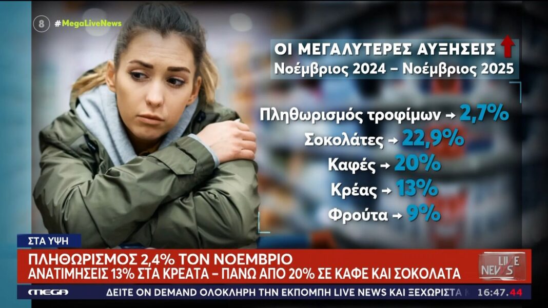 Ο πληθωρισμός συνεχίζει να αυξάνεται, φτάνοντας το 2,4% τον Νοέμβριο. Οι ανατιμήσεις στα κρέατα αγγίζουν το 13%, ενώ οι τιμές του καφέ και της σοκολάτας έχουν ξεπεράσει το 20%, επιβαρύνοντας σημαντικά το οικογενειακό budget.