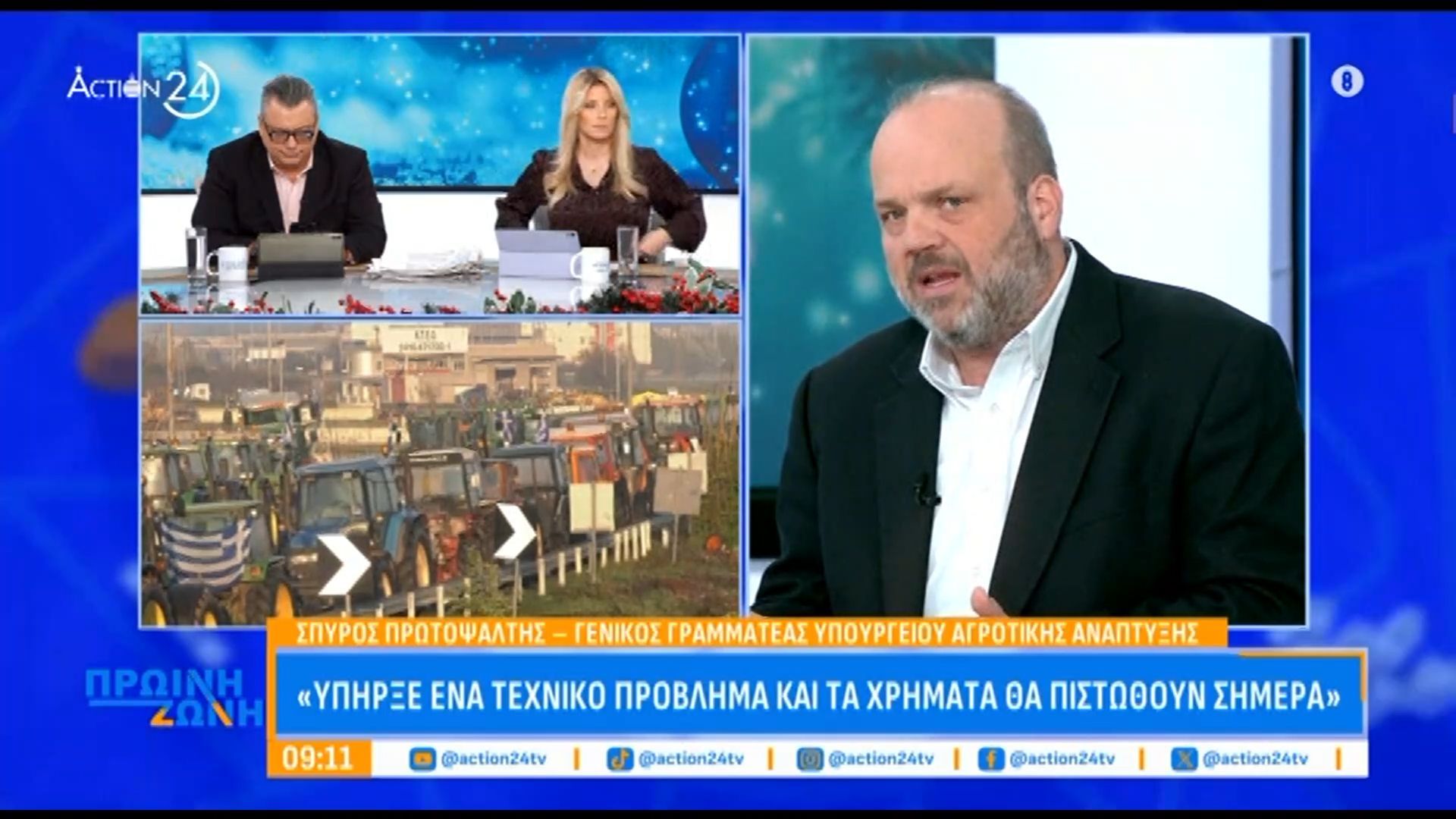 Ο γενικός γραμματέας Αγροτικής Ανάπτυξης, Σπύρος Πρωτοψάλτης, αναφέρθηκε σε πρόσφατο τεχνικό πρόβλημα που επηρέασε τις διαδικασίες πληρωμών. Σύμφωνα με τον ίδιο, τα ζητήματα έχουν επιλυθεί και τα χρήματα θα πιστωθούν στους δικαιούχους σήμερα, 17 Δεκεμβρίου.