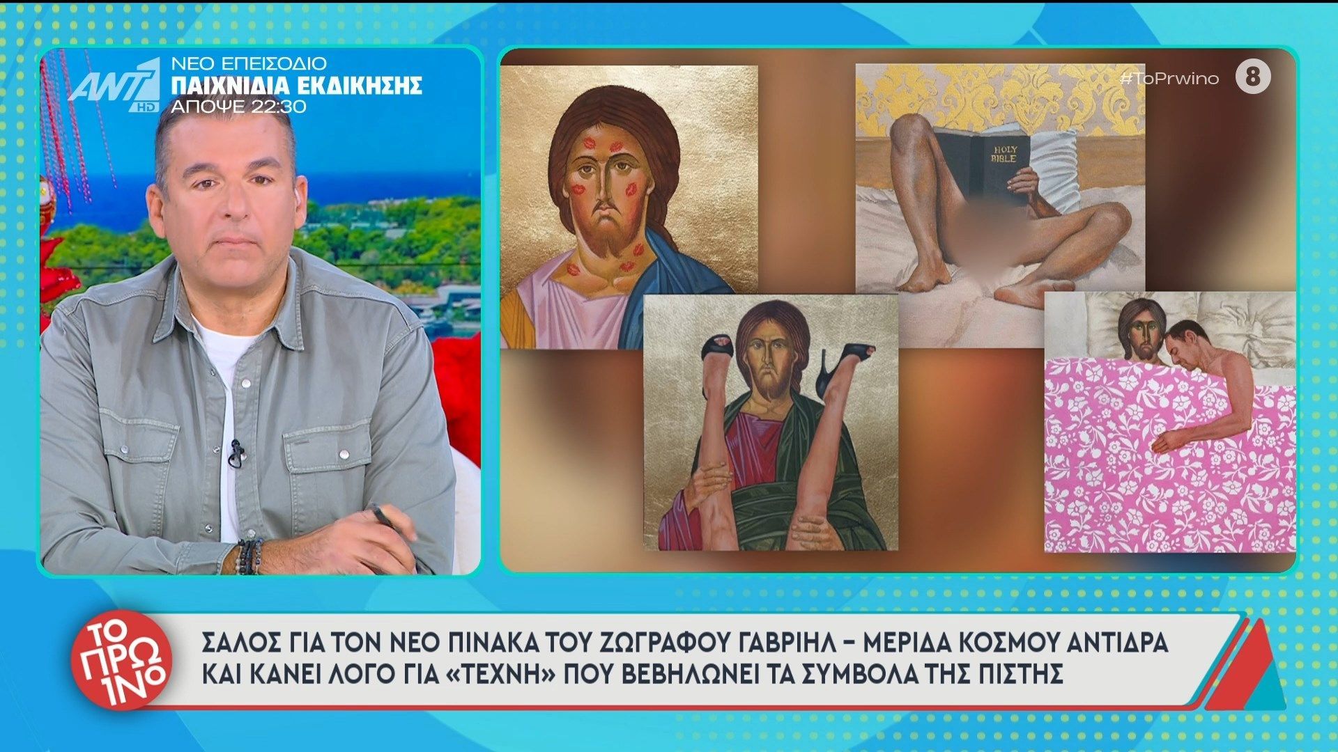 Ο Αρχιεπίσκοπος Κύπρου Γεώργιος και ο ζωγράφος Γαβριήλ συζητούν για τον νέο πίνακα του καλλιτέχνη, ο οποίος έχει προκαλέσει έντονες αντιδράσεις στο κοινό. Ο πίνακας, που φέρει ισχυρούς συμβολισμούς, έχει αναδείξει διαφωνίες σχετικά με την τέχνη και την θρησκεία, κεντρίζοντας το ενδιαφέρον των μέσων ενημέρωσης.