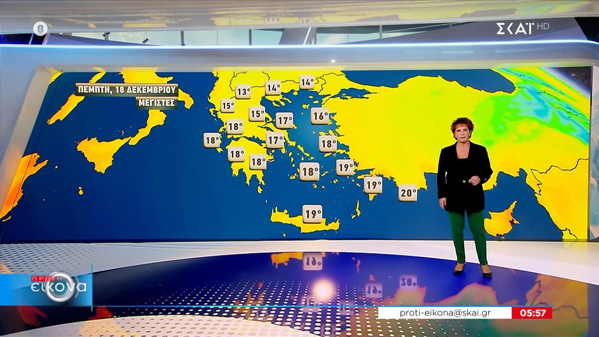 Η Χριστίνα Σούζη, μετεωρολόγος του ΣΚΑΪ, παρουσιάζει την πρόγνωση του καιρού για την Πέμπτη, 18 Δεκεμβρίου 2026. Οι θερμοκρασίες αναμένονται να κυμανθούν σε κανονικά επίπεδα για την εποχή, με πιθανές βροχοπτώσεις σε αρκετές περιοχές της χώρας.