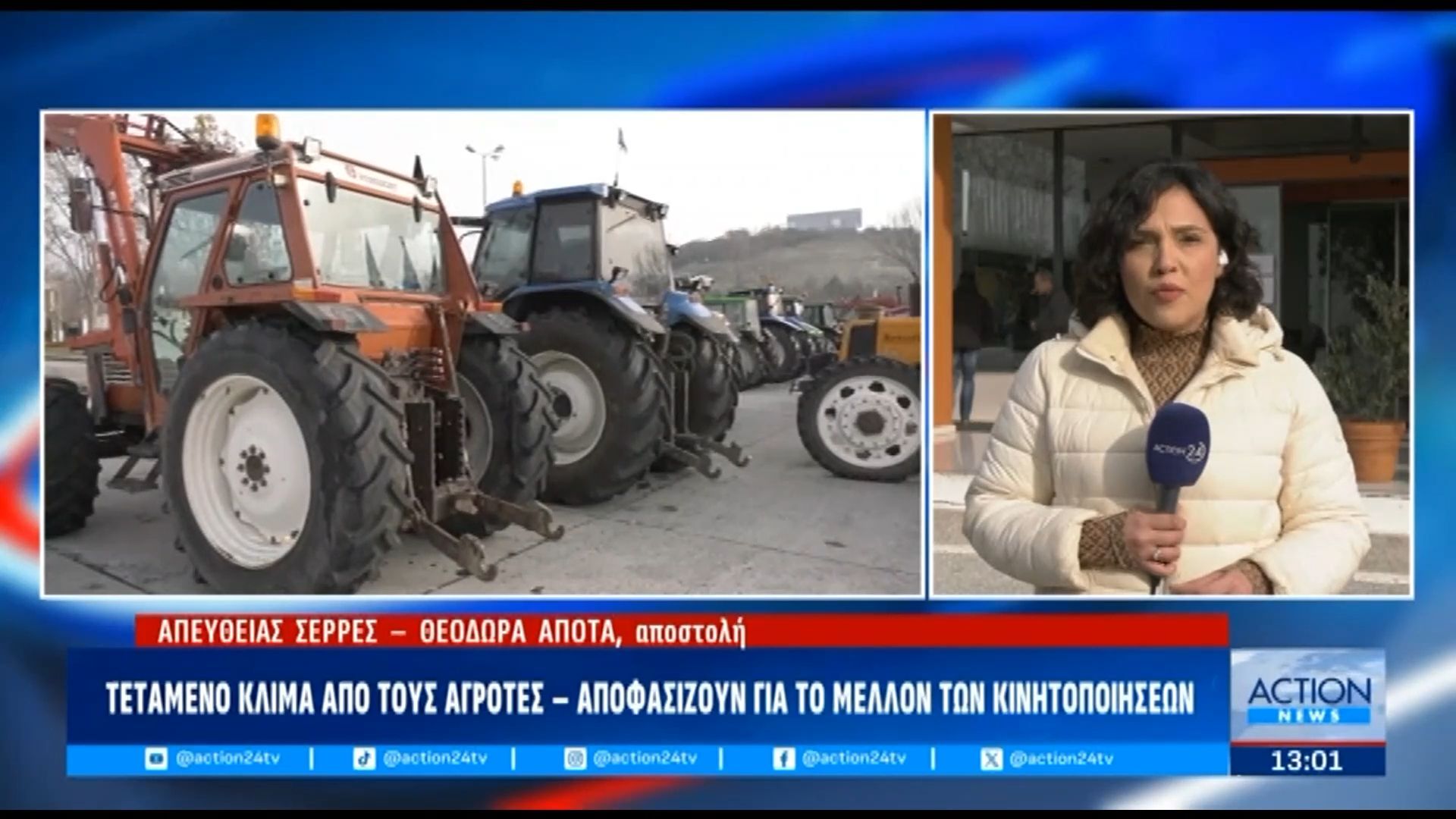 Σε κλίμα έντασης, οι αγρότες συγκεντρώθηκαν σήμερα το μεσημέρι στις Σέρρες για να αποφασίσουν τη συνέχιση των κινητοποιήσεών τους. Η πανελλαδική σύσκεψη αποσκοπεί στην οργάνωση και στρατηγική των κινητοποιήσεων, καθώς οι συμμετέχοντες εκφράζουν την ανησυχία τους για τις τρέχουσες συνθήκες στον αγροτικό τομέα.