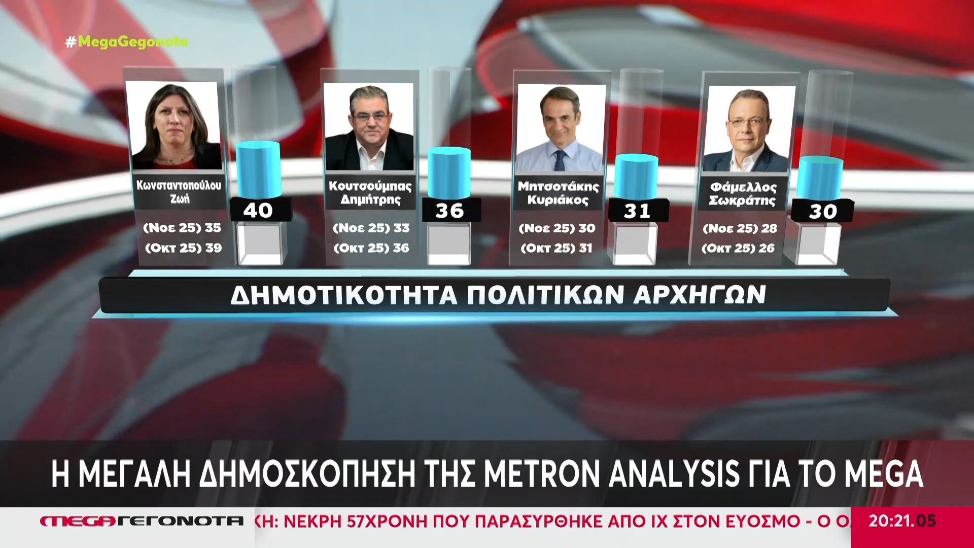 Σύμφωνα με τη νέα δημοσκόπηση της Metron Analysis, οι πολιτικοί αρχηγοί Ζωής Κωνσταντοπούλου και Δημήτρης Κουτσούμπας καταγράφουν σημαντική αύξηση στη δημοτικότητά τους. Η έρευνα δείχνει ότι οι πολίτες αναγνωρίζουν τις προσπάθειές τους και τη στάση τους απέναντι σε κρίσιμα ζητήματα της επικαιρότητας.