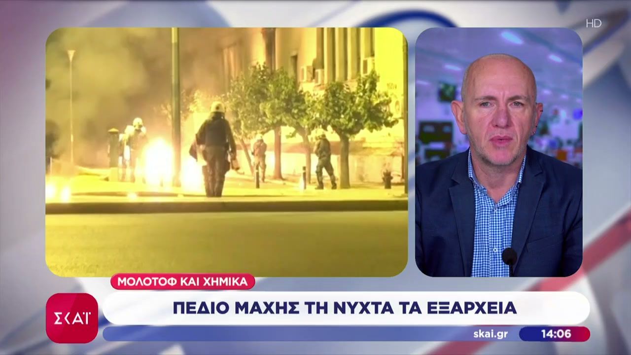 Στο κέντρο των Εξαρχείων, η νύχτα μετατράπηκε σε πεδίο συγκρούσεων, με ισχυρές αστυνομικές δυνάμεις να αντιμετωπίζουν ομάδες διαδηλωτών. Οι δρόμοι γέμισαν με δακρυγόνα και φλεγόμενα αντικείμενα, ενώ οι πολίτες παρακολουθούσαν την κατάσταση από ασφαλή απόσταση.