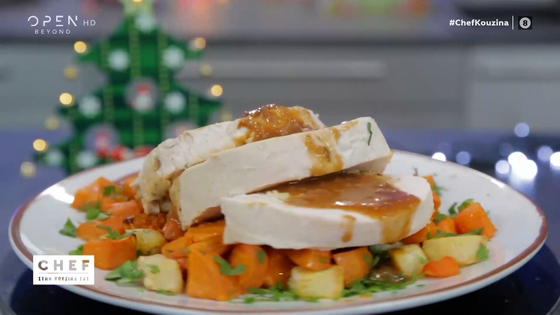 Ο Βαγγέλης Δρίσκας προετοιμάζει μία εξαιρετική συνταγή για το χριστουγεννιάτικο τραπέζι, εστιάζοντας σε ένα γεμιστό ρολό γαλοπούλας. Το πιάτο συνδυάζει ζουμερή γαλοπούλα με μοναδικές γεύσεις, ενώ η γέμιση περιλαμβάνει προσεκτικά επιλεγμένα υλικά που ενισχύουν τη γεύση και την υφή.