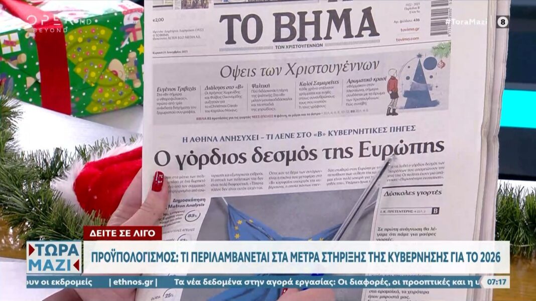 Σήμερα, αναλύουμε τα πρωτοσέλιδα των εφημερίδων που κυκλοφορούν στις 21 Δεκεμβρίου 2025. Οι τίτλοι επικεντρώνονται σε σημαντικά πολιτικά και κοινωνικά ζητήματα, προσφέροντας μια εικόνα των τρεχουσών εξελίξεων στη χώρα.