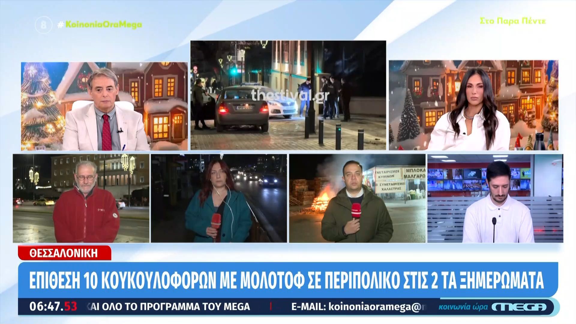Στις 2 τα ξημερώματα, ομάδα δέκα κουκουλοφόρων επιτέθηκε σε περιπολικό στη Θεσσαλονίκη, χρησιμοποιώντας βόμβες μολότοφ. Η επίθεση σημειώθηκε σε κεντρικό δρόμο της πόλης και προκάλεσε αναστάτωση στους κατοίκους της περιοχής.