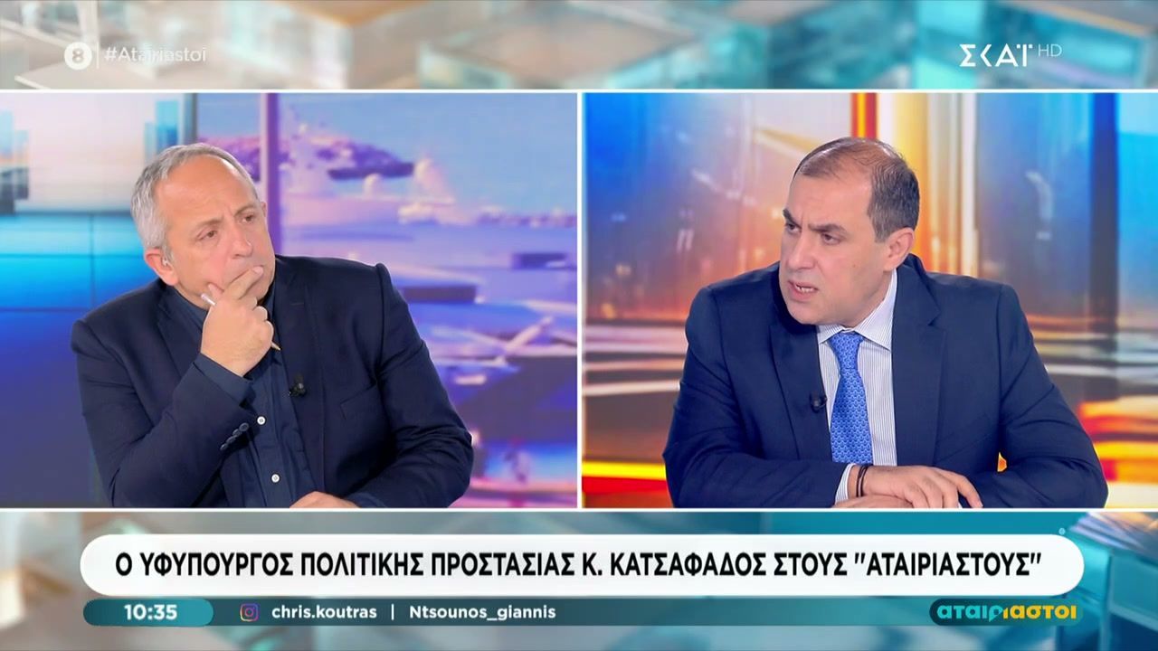 Ο Υφυπουργός Πολιτικής Προστασίας, Κ. Κατσαφάδος, βρέθηκε στο στούντιο των “Αταίριαστων” για μια ενδιαφέρουσα συζήτηση σχετικά με τις προκλήσεις που αντιμετωπίζει η χώρα στον τομέα της πολιτικής προστασίας. Οι παρουσιαστές, Γιάννης Ντσούνος και Χρήστος Κούτρας, έθεσαν κρίσιμα ερωτήματα για τις πρόσφατες εξελίξεις και τις στρατηγικές που εφαρμόζονται για την ασφάλεια των πολιτών.