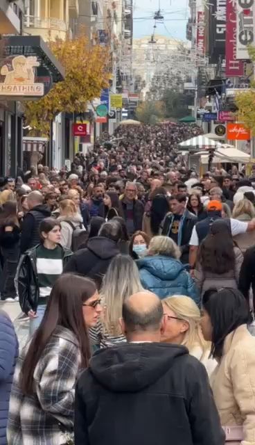 Η Ερμού έχει μετατραπεί σε σημείο συγκέντρωσης πλήθους πολιτών, καθώς οι προετοιμασίες για τις γιορτές έχουν ξεκινήσει. Οι καταναλωτές σχηματίζουν μεγάλες ουρές έξω από τα καταστήματα, αναζητώντας δώρα και προσφορές, γεγονός που καταδεικνύει την αυξημένη καταναλωτική διάθεση.