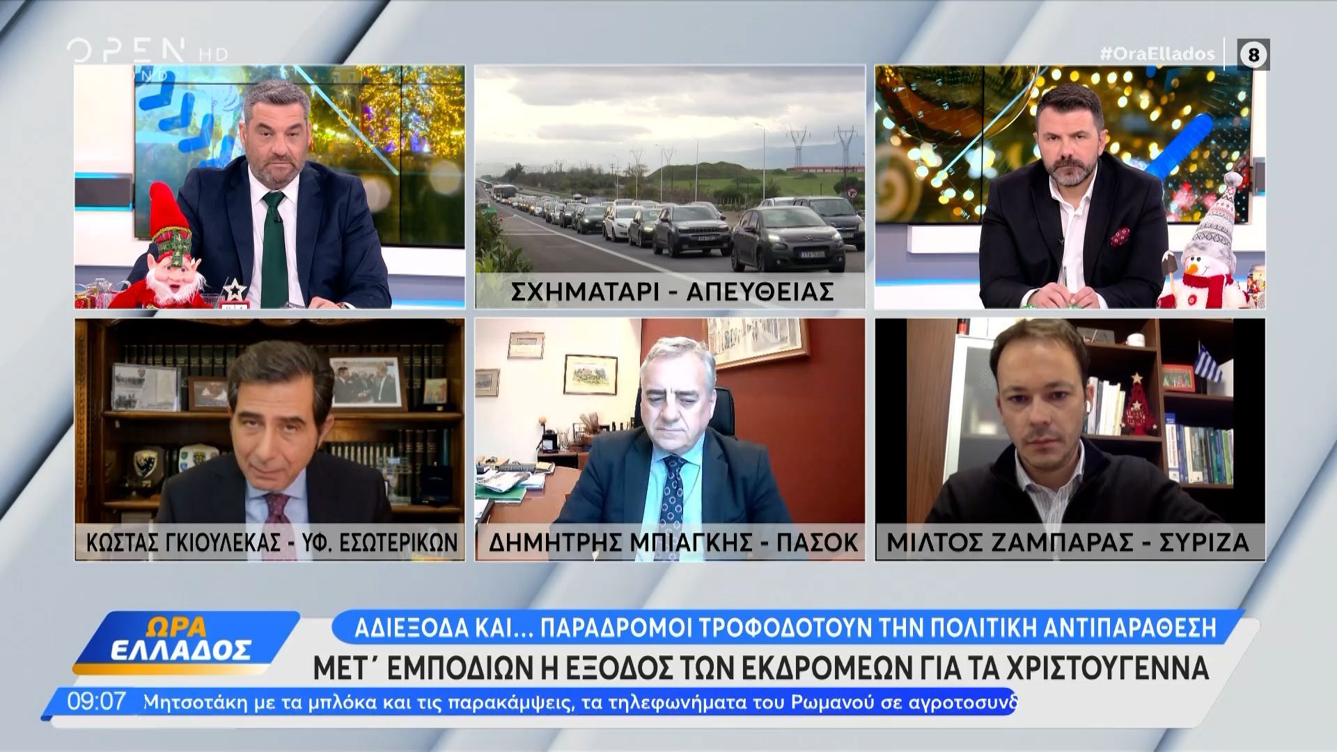 Στην πρόσφατη εκπομπή, οι εκπρόσωποι των κομμάτων ΝΔ, ΠΑΣΟΚ και ΣΥΡΙΖΑ αντάλλαξαν απόψεις σχετικά με τα αγροτικά μπλόκα που έχουν προκαλέσει σοβαρές αναταράξεις στην κυκλοφορία. Ο Κωνσταντίνος Γκιουλέκας, ο Δημήτρης Μπιάγκης και ο Μίλτος Ζαμπάρας εξέφρασαν τις θέσεις τους για την κατάσταση και τις επιπτώσεις της στους εκδρομείς που προσπαθούν να ταξιδέψουν ενόψει των εορτών.